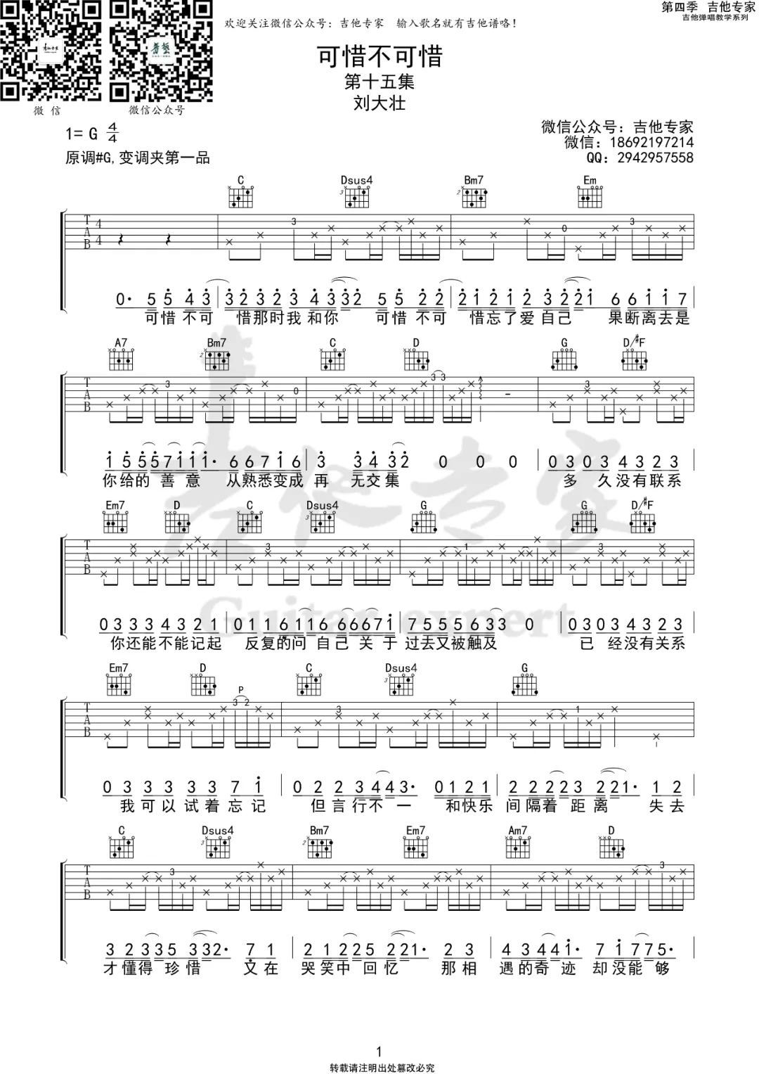 曲谱介绍: 刘大壮《可惜不可惜》吉他弹唱谱,采用G调指法编配,共有3张高清图谱。