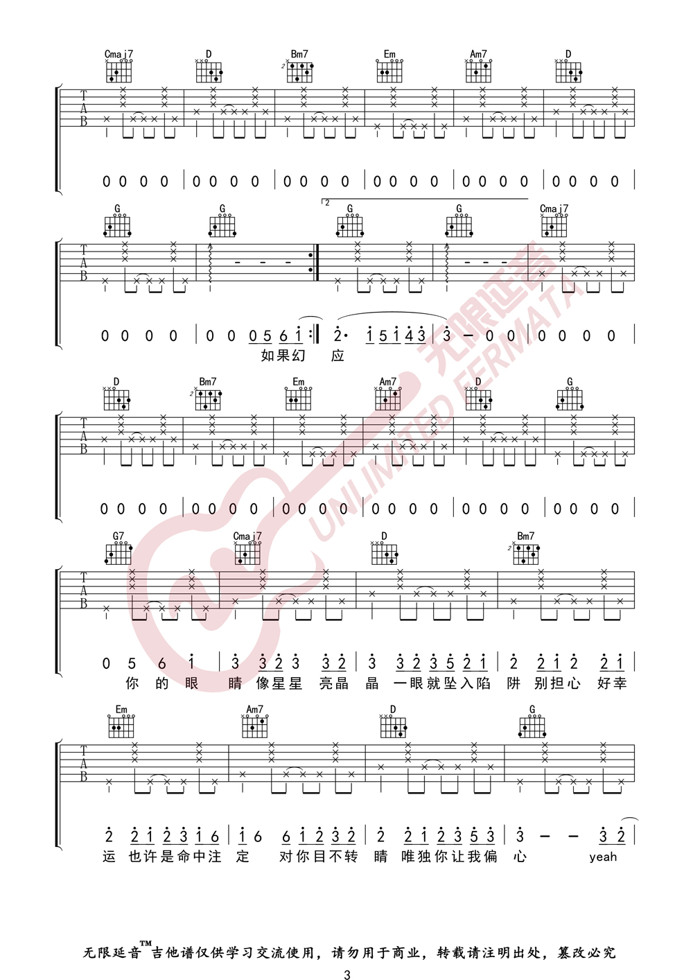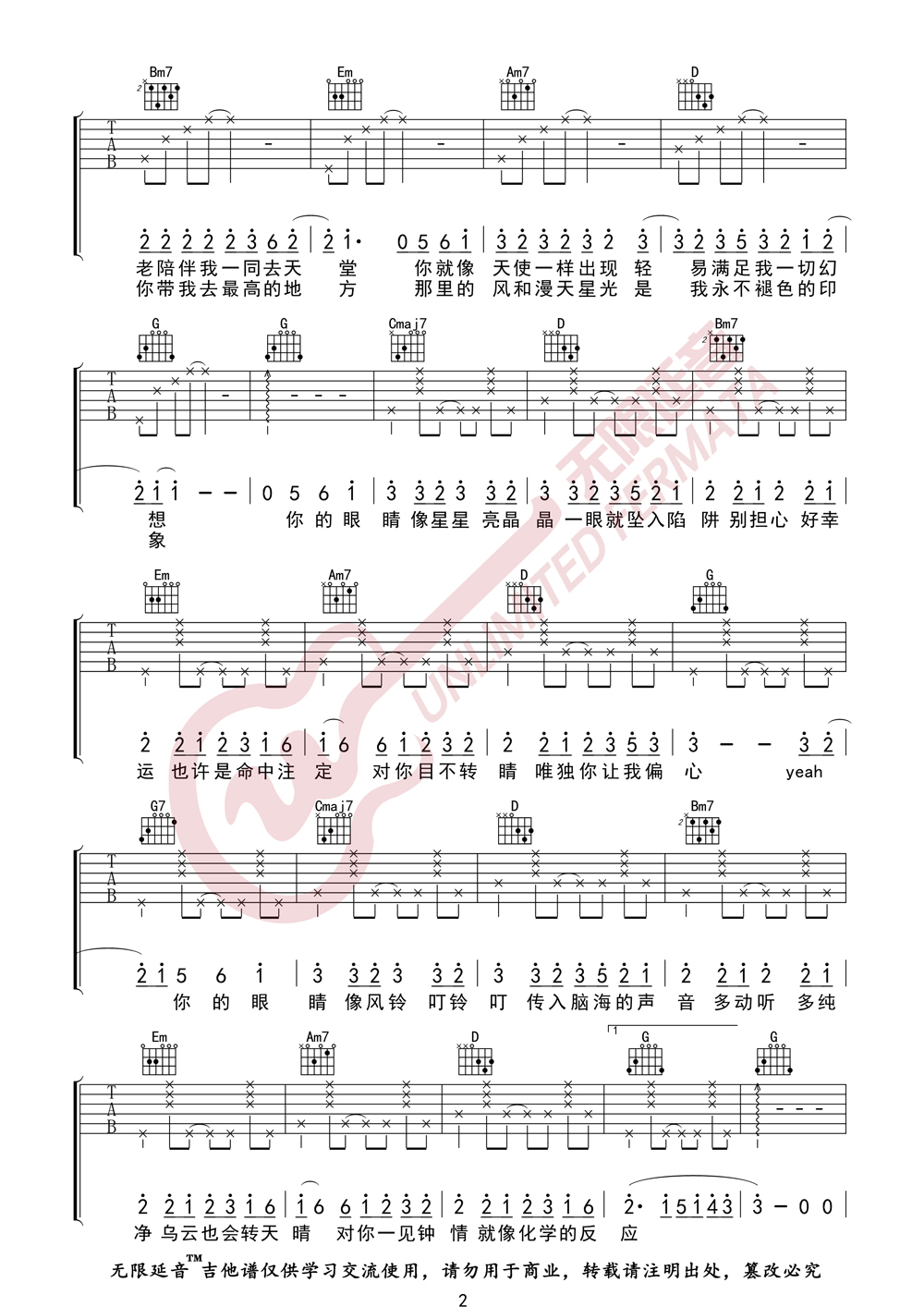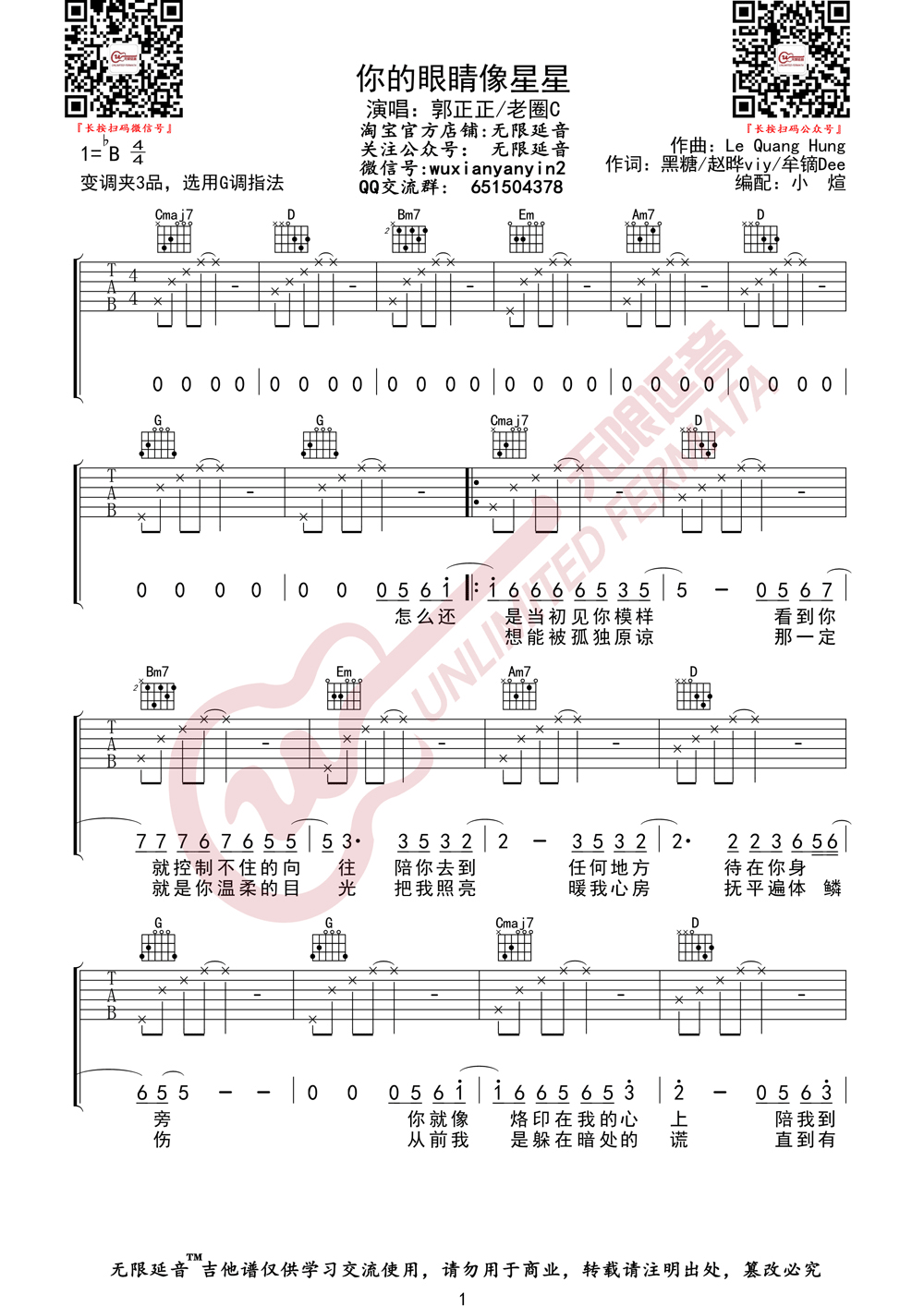 曲谱介绍: 郭正正/老圈C《你的眼睛像星星》吉他弹唱谱,采用G调指法编配,共有3张高清图谱。