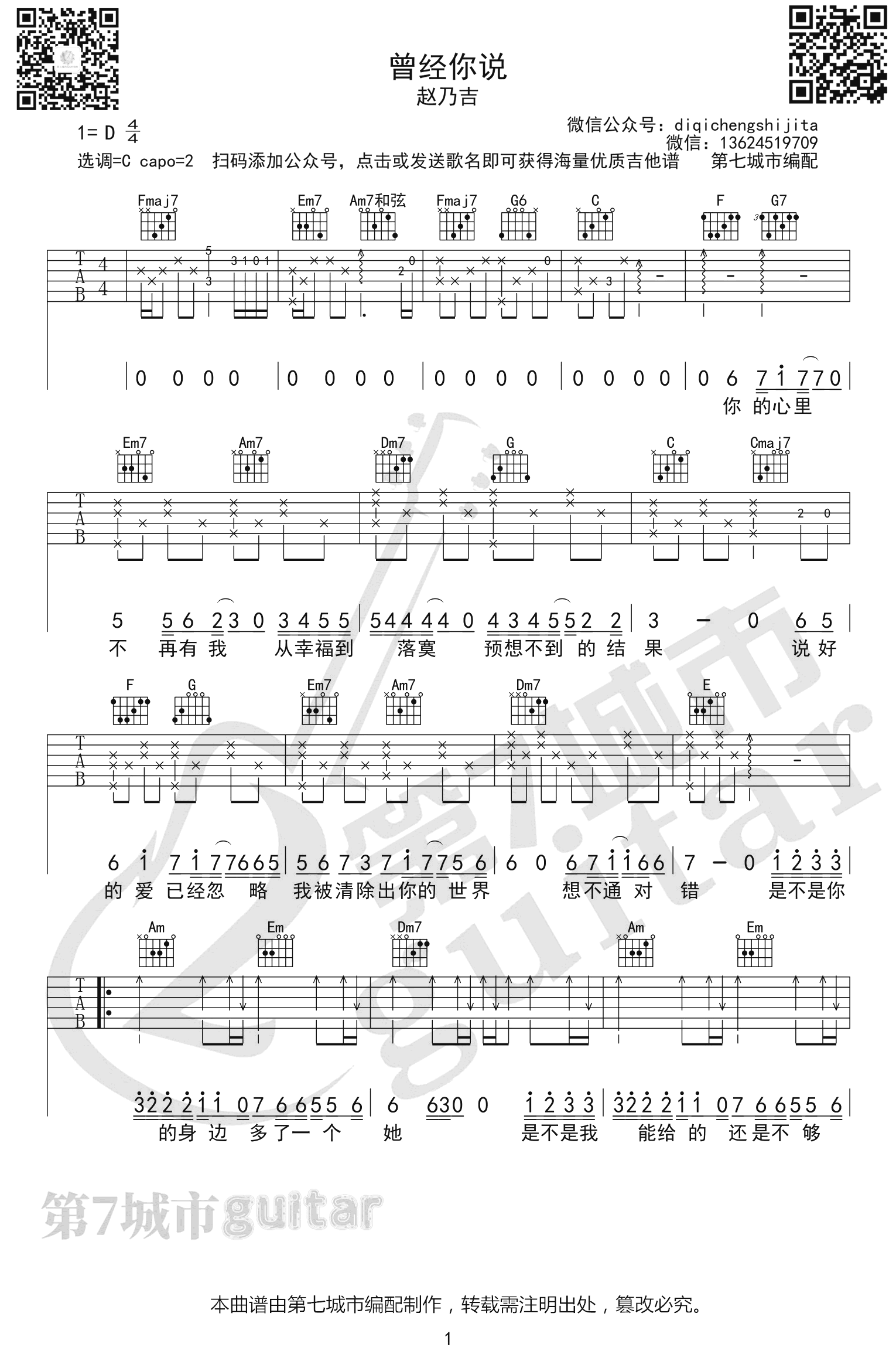 曲谱介绍: 赵乃吉《曾经你说》吉他弹唱谱,采用C调指法编配,共有3张高清图谱。