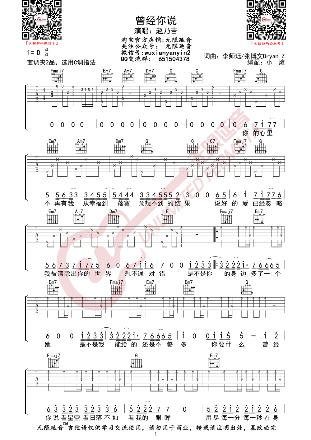 曲谱介绍: 赵乃吉《曾经你说》吉他弹唱谱,采用C调指法编配原版,共有3张高清图谱。