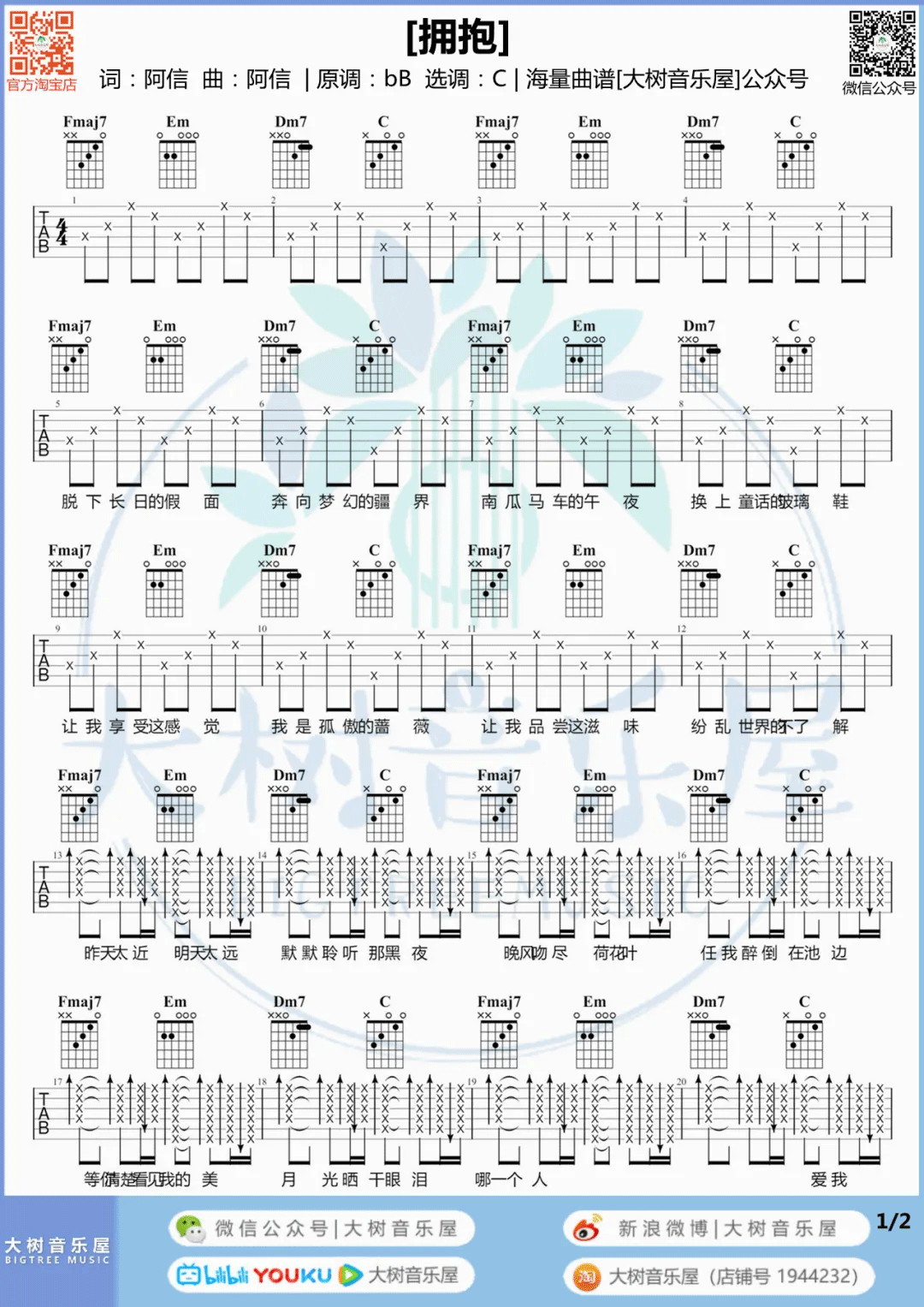 曲谱介绍: 五月天《拥抱》吉他弹唱谱,采用C调指法编配,共有2张高清图谱,免翻页排版设计。