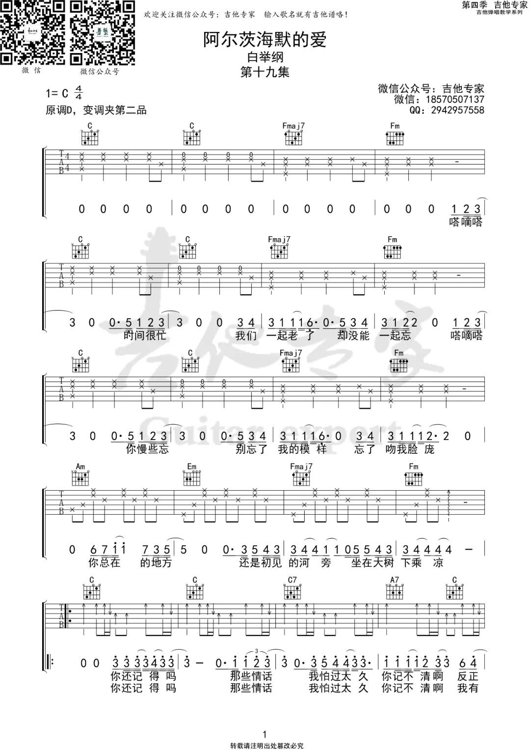 曲谱介绍: 白举纲《阿尔茨海默的爱》吉他弹唱谱,采用C调指法编配,共有2张高清图谱,免翻页排版设计。