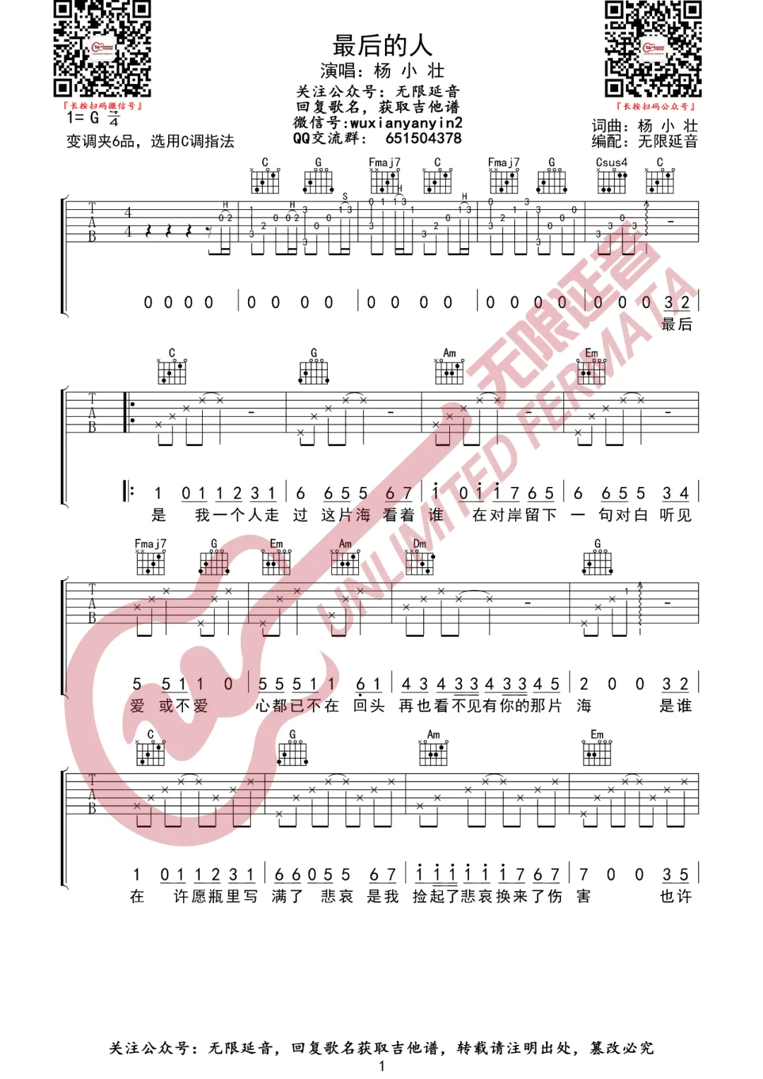 曲谱介绍: 杨小壮《最后的人》吉他弹唱谱,采用C调指法编配原版,共有3张高清图谱。