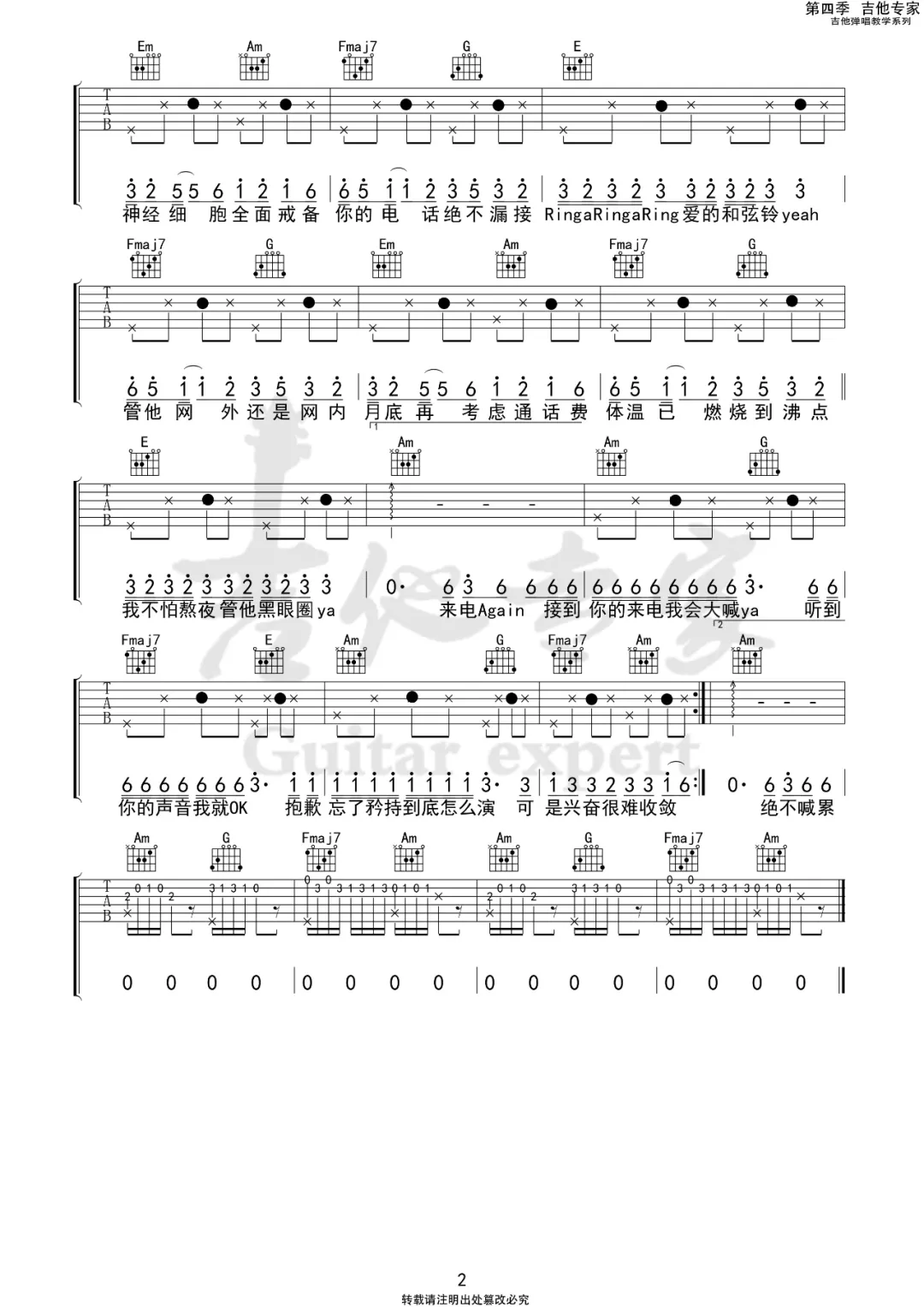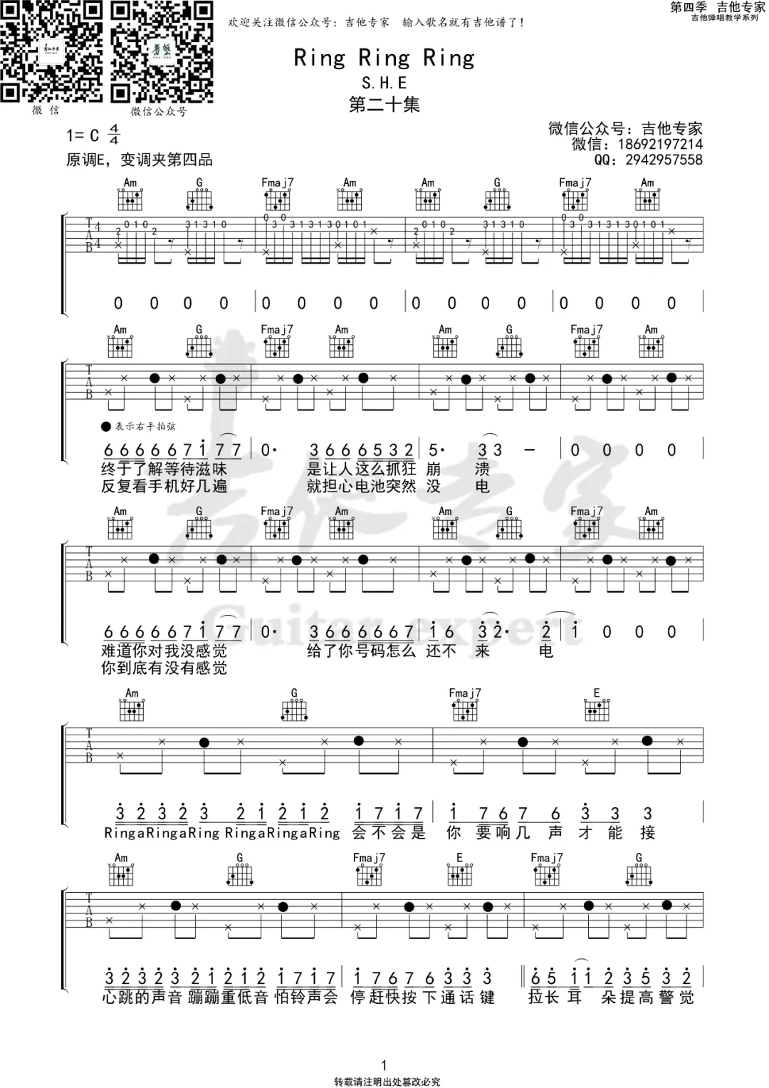 曲谱介绍: S.H.E《RingRingRing》吉他弹唱谱,采用C调指法编配原版,共有2张高清图谱,免翻页排版设计。