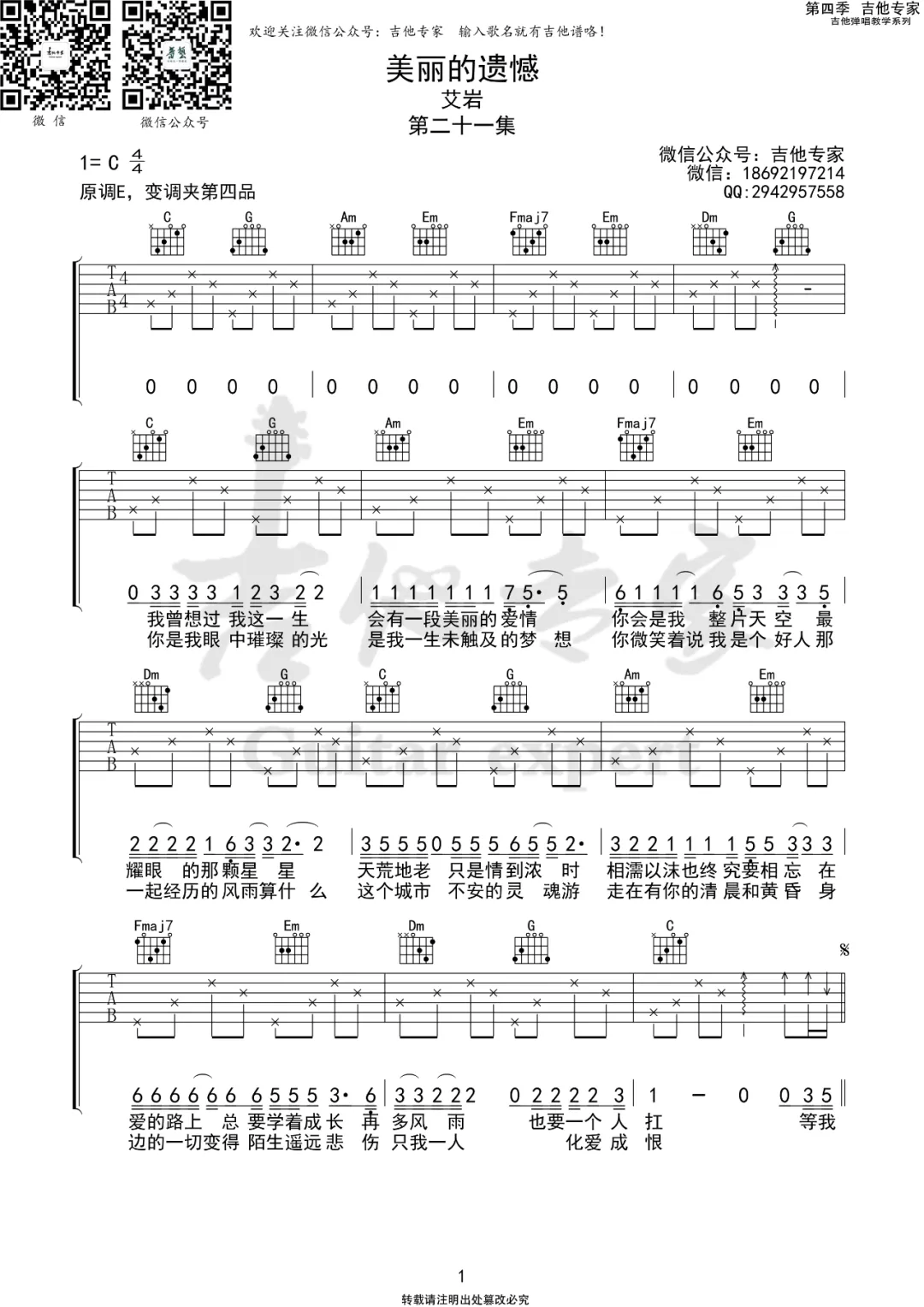 曲谱介绍: 艾岩《美丽的遗憾》吉他弹唱谱,采用C调指法编配,共有2张高清图谱,免翻页排版设计。