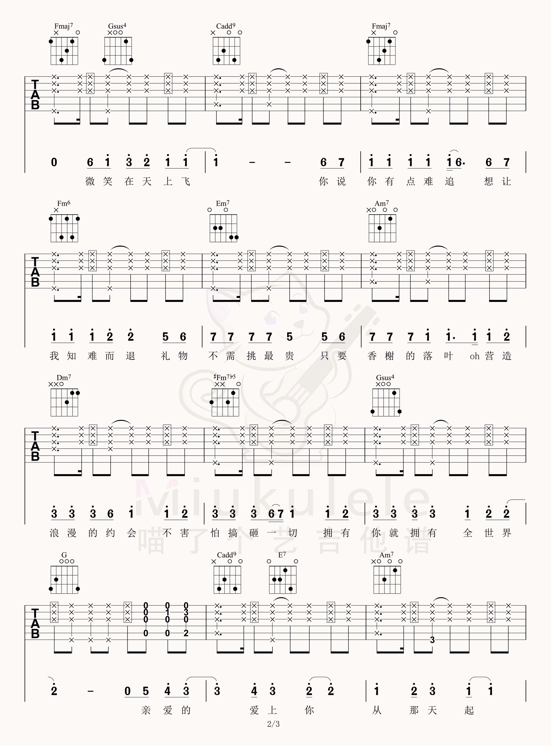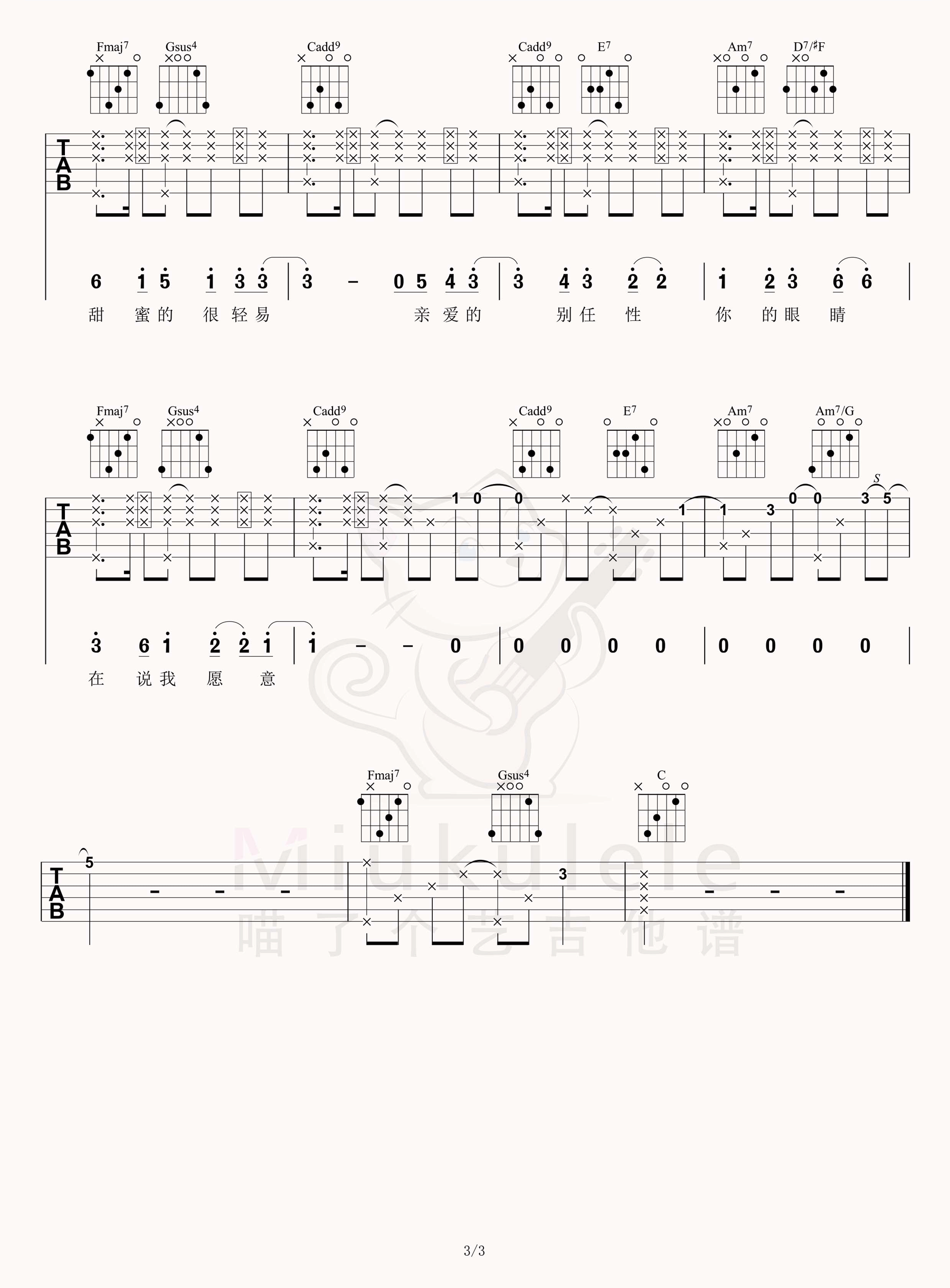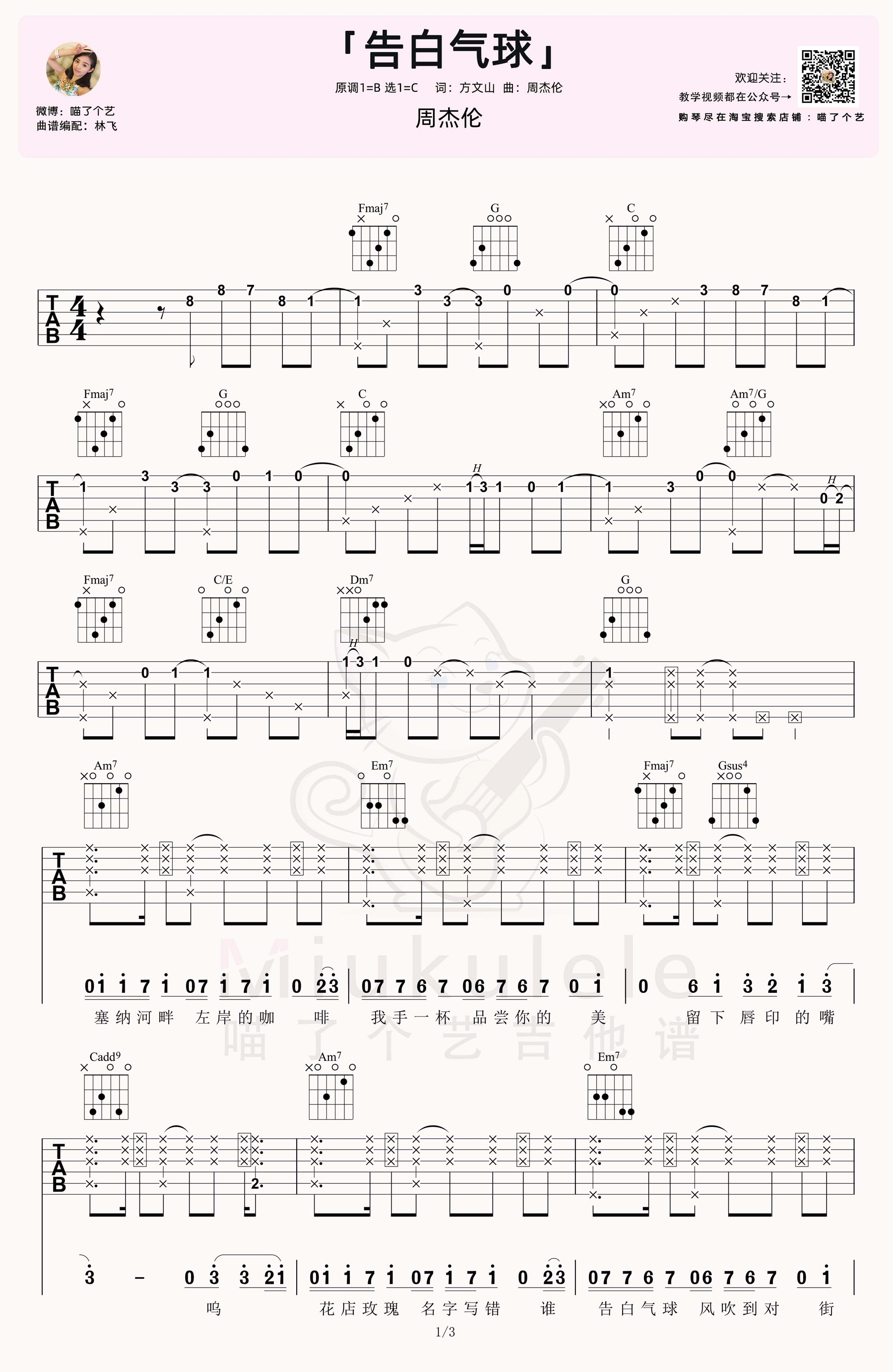 曲谱介绍: 周杰伦《告白气球》吉他弹唱谱,采用C调指法编配原版,共有3张高清图谱。