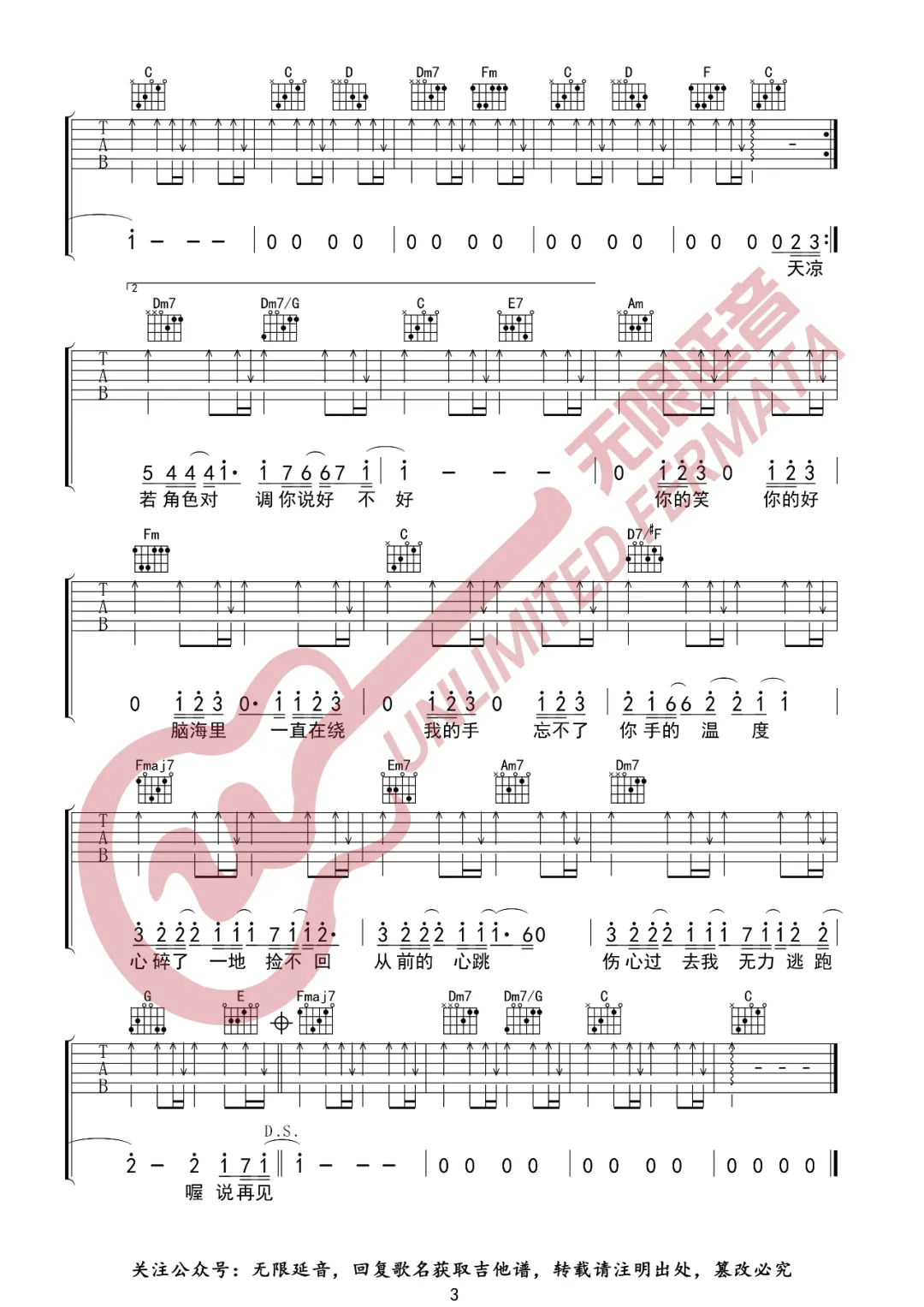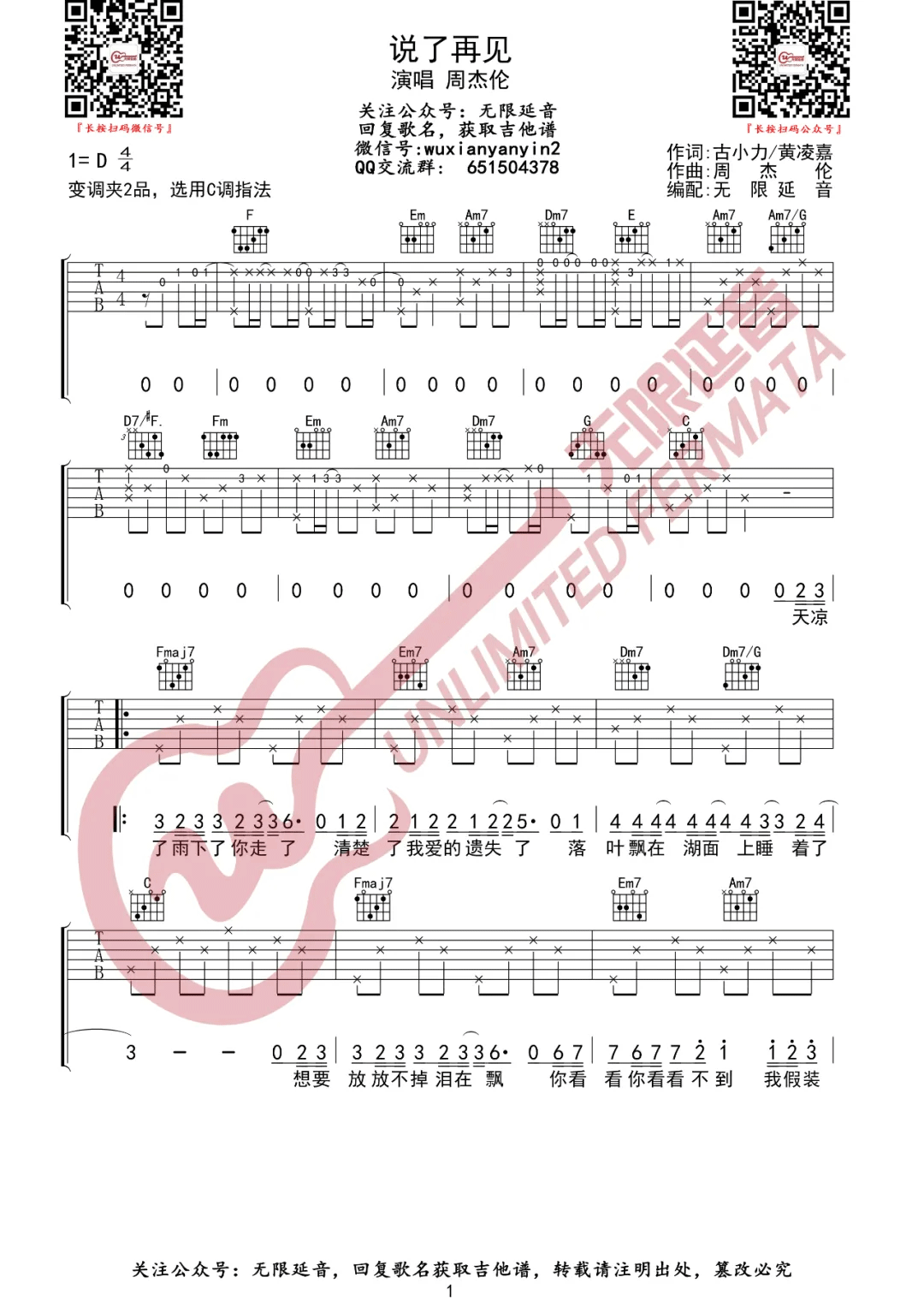 曲谱介绍: 周杰伦《说了再见》吉他弹唱谱,采用C调指法编配原版,共有3张高清图谱。