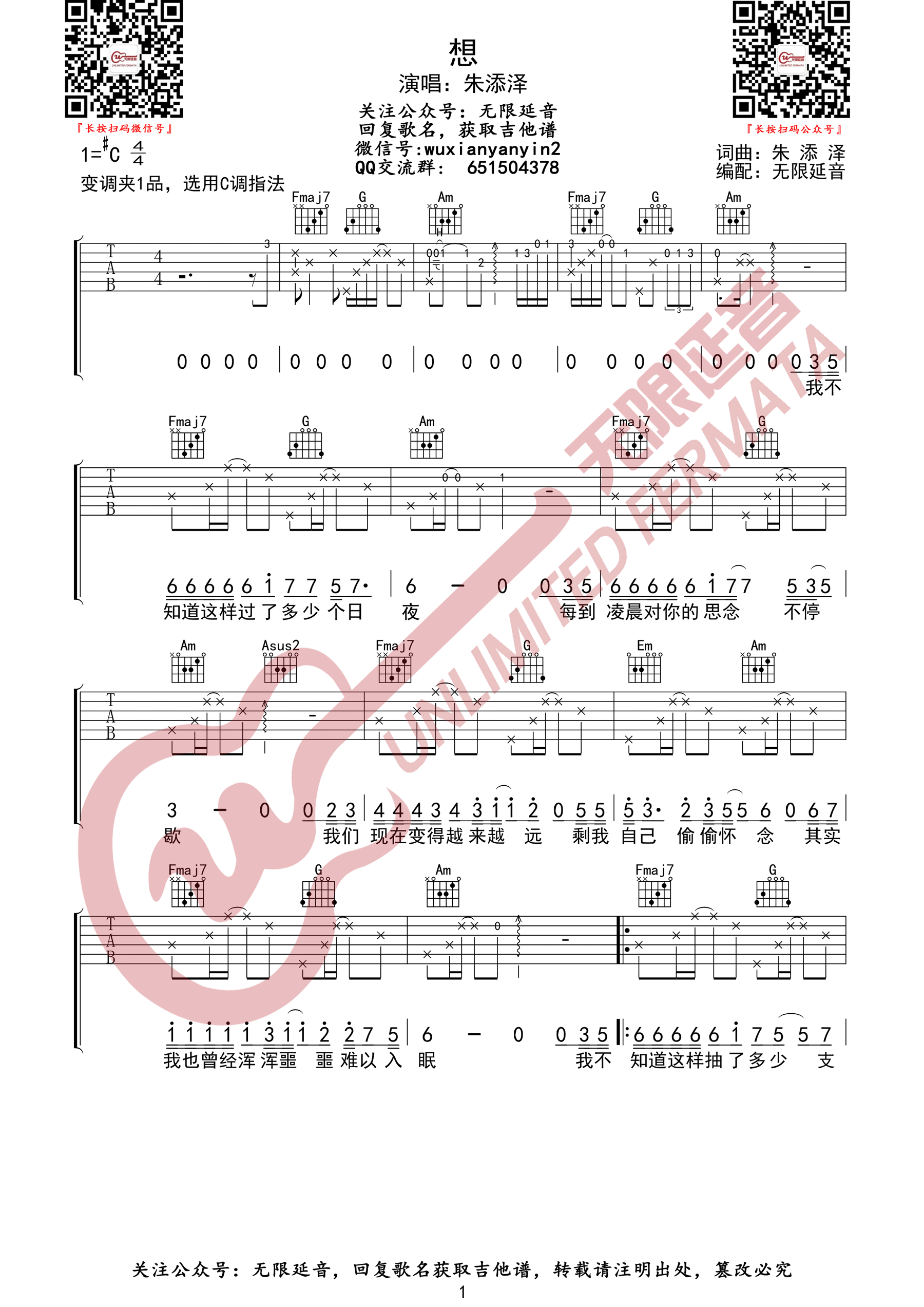 曲谱介绍: 朱添泽《想》吉他弹唱谱,采用C调指法编配原版,共有3张高清图谱。