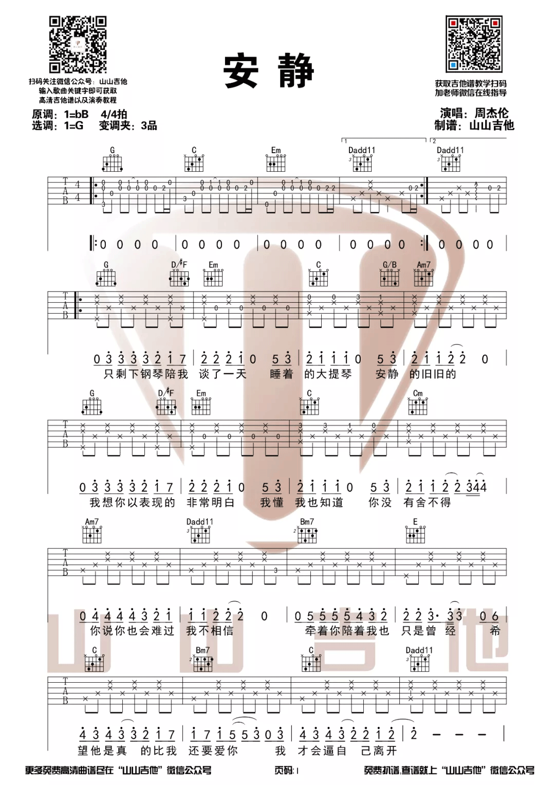 曲谱介绍: 周杰伦《安静》吉他弹唱谱,采用G调指法编配原版,共有3张高清图谱。
