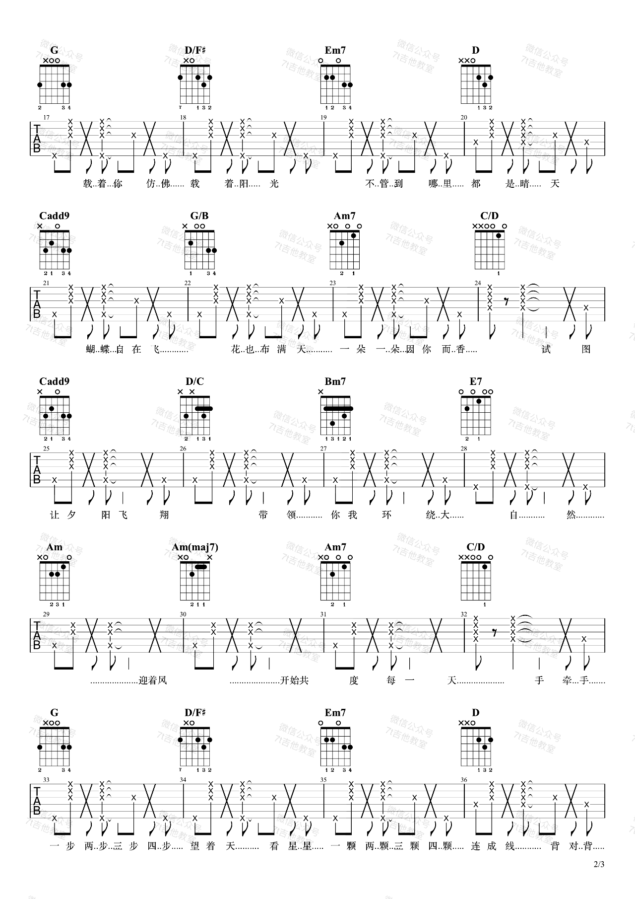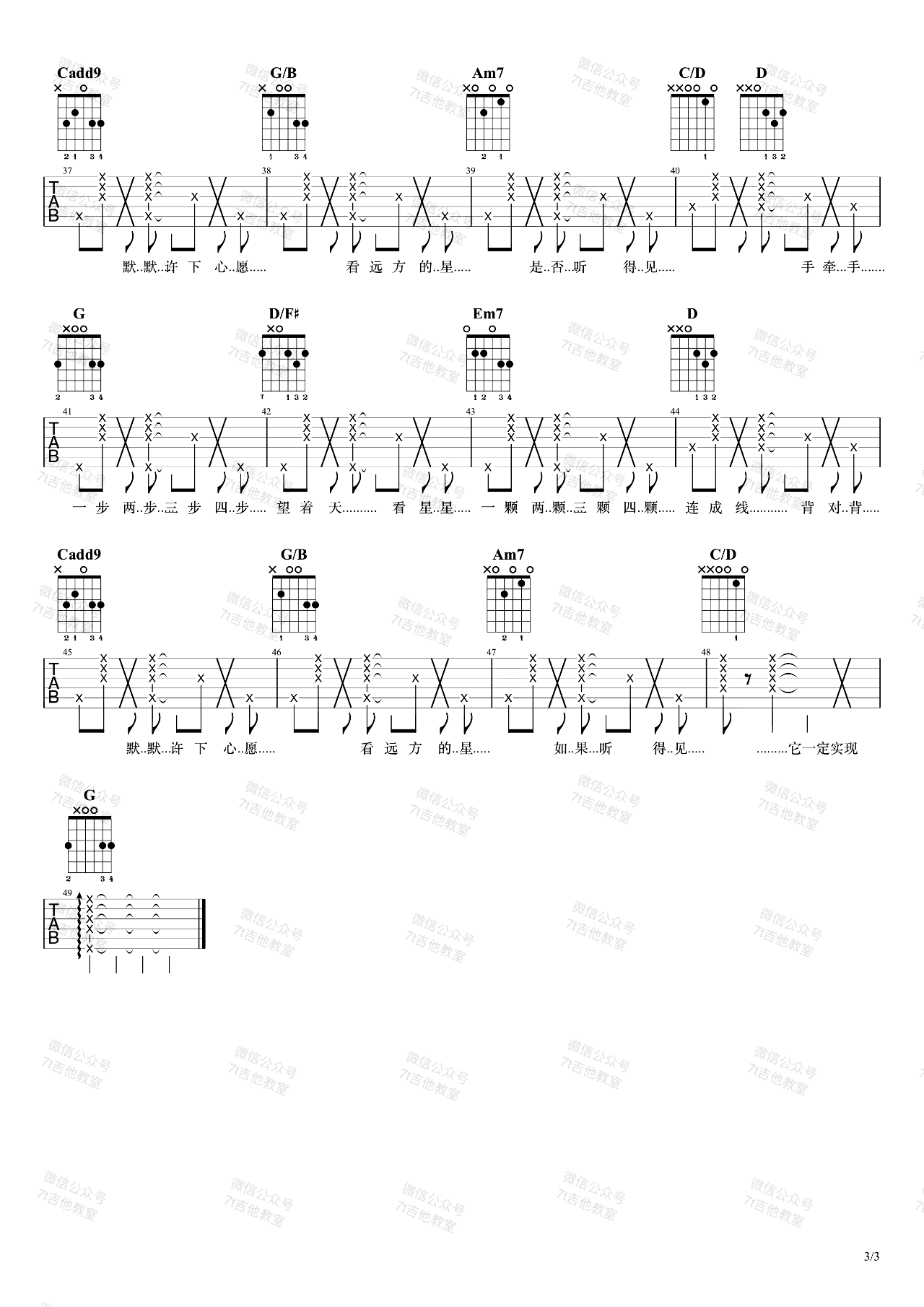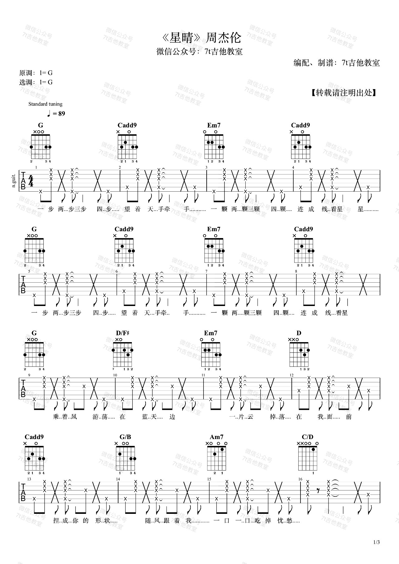 曲谱介绍: 周杰伦《星晴》吉他弹唱谱,采用G调指法编配,共有3张高清图谱。