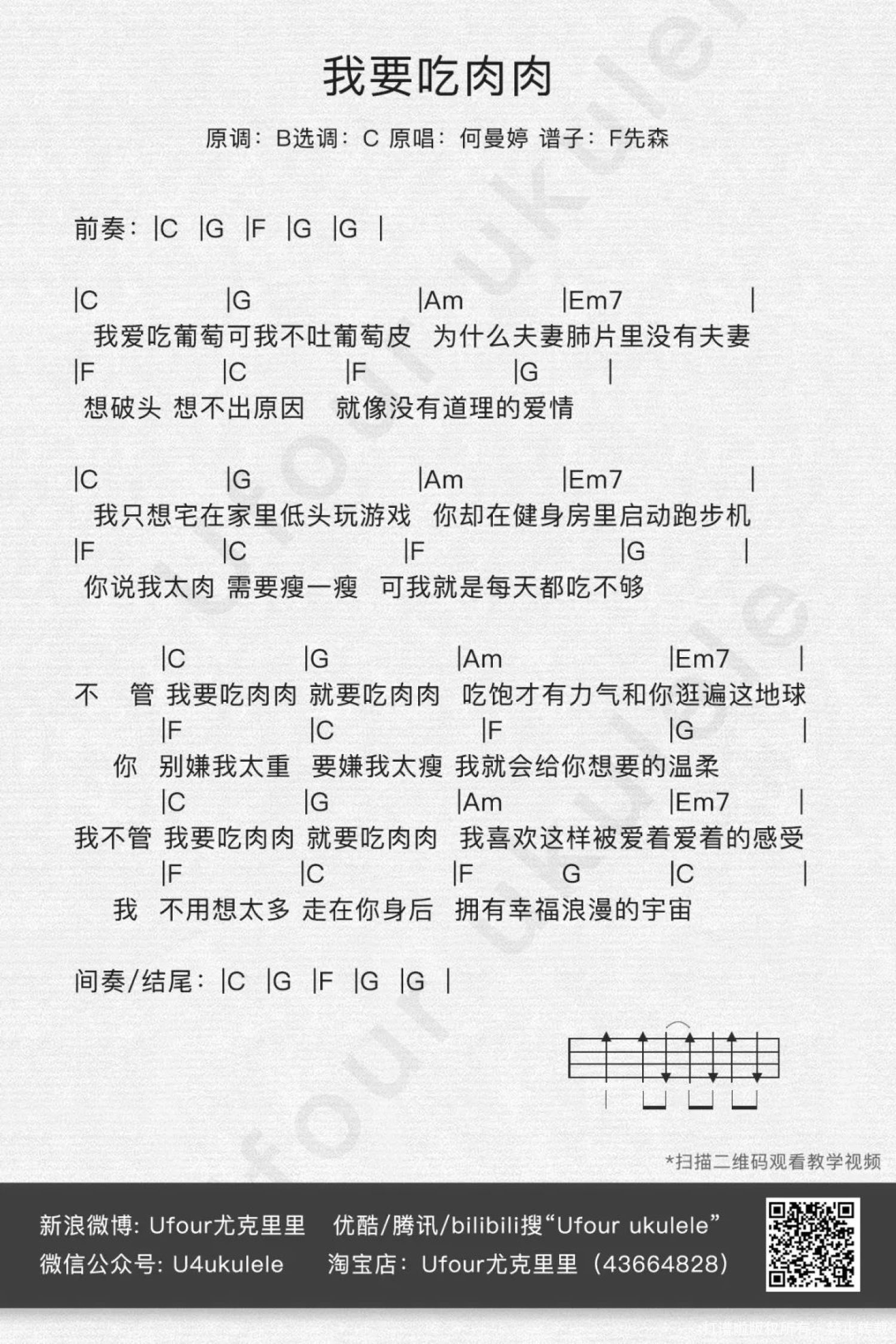 曲谱介绍: F有一个调皮捣蛋聪明伶俐的学生,小学二年级的小女生,为了让她好好练琴完成我给她留下的作业,我答应她如果能流畅地把《天空之城》弹下来,就答应教她一首她喜欢的歌。 半个月前她终于把《天空之城》弹下来了,然后告诉我,她想要学何曼婷的《我要吃肉肉》。 要不是她还是个孩子,我都快怀疑她是故意点这首歌的。没办法,为人师表要以身作则,说到做到,只能默默地打开手机开始听这首歌。 emmm...还是首抖音神曲??? 全程大概花了两个下午的时间,把谱子弄下来之后就开始练唱,这首歌和我格格不入,一点都不适合我,可是没办法,硬着头皮弄呗。都是我对学生的爱让我坚持完成这首扎心之作啊,每唱一次副歌就感觉打自己一次脸.... 小嘿同学表示快听吐了。 为了让ukulele的声音更可爱,我找了支S型的ukulele把定弦高一个全音(复古调AD#FB),大家如果跟着视频弹发现声音不对,请拿个变调夹夹2品。 谱子我就po在下面和微博了,大家也可以到网易云音乐@F先森 收听我平时翻弹的曲子,360度旋转求评论点赞....