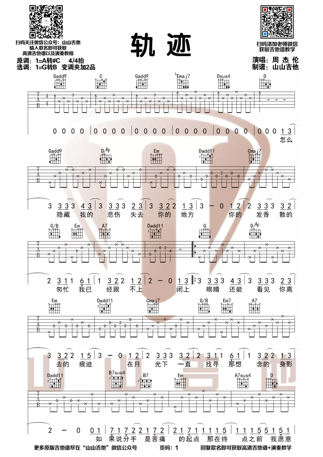 曲谱介绍: 周杰伦《轨迹》吉他弹唱谱,采用G调指法编配原版,共有3张高清图谱。