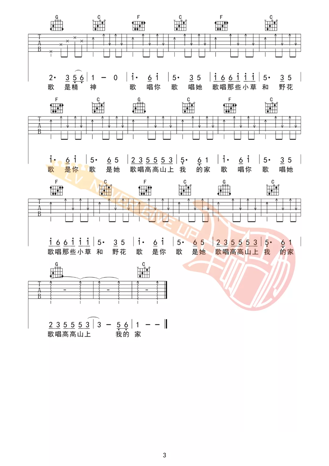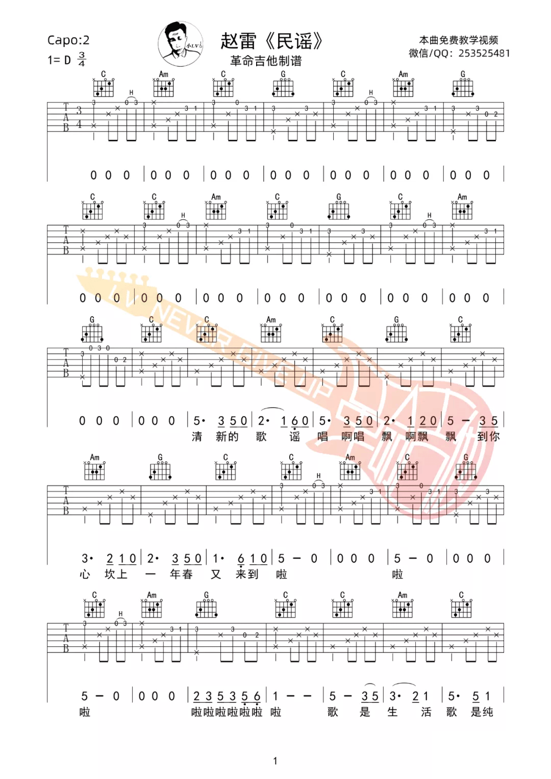 曲谱介绍: 赵雷《民谣》吉他弹唱谱,采用C调指法编配原版,共有3张高清图谱。