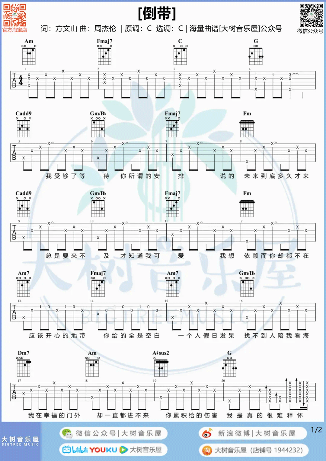 曲谱介绍: 蔡依林《倒带》吉他弹唱谱,采用C调指法编配原版,共有2张高清图谱,免翻页排版设计。