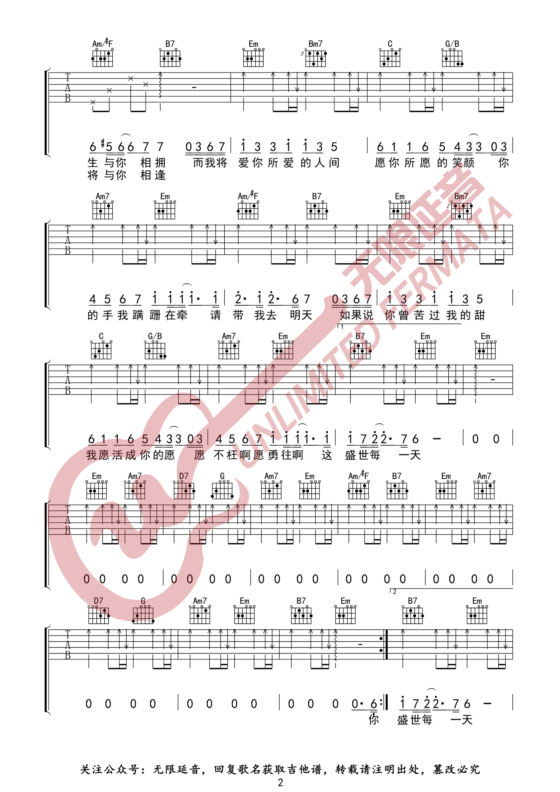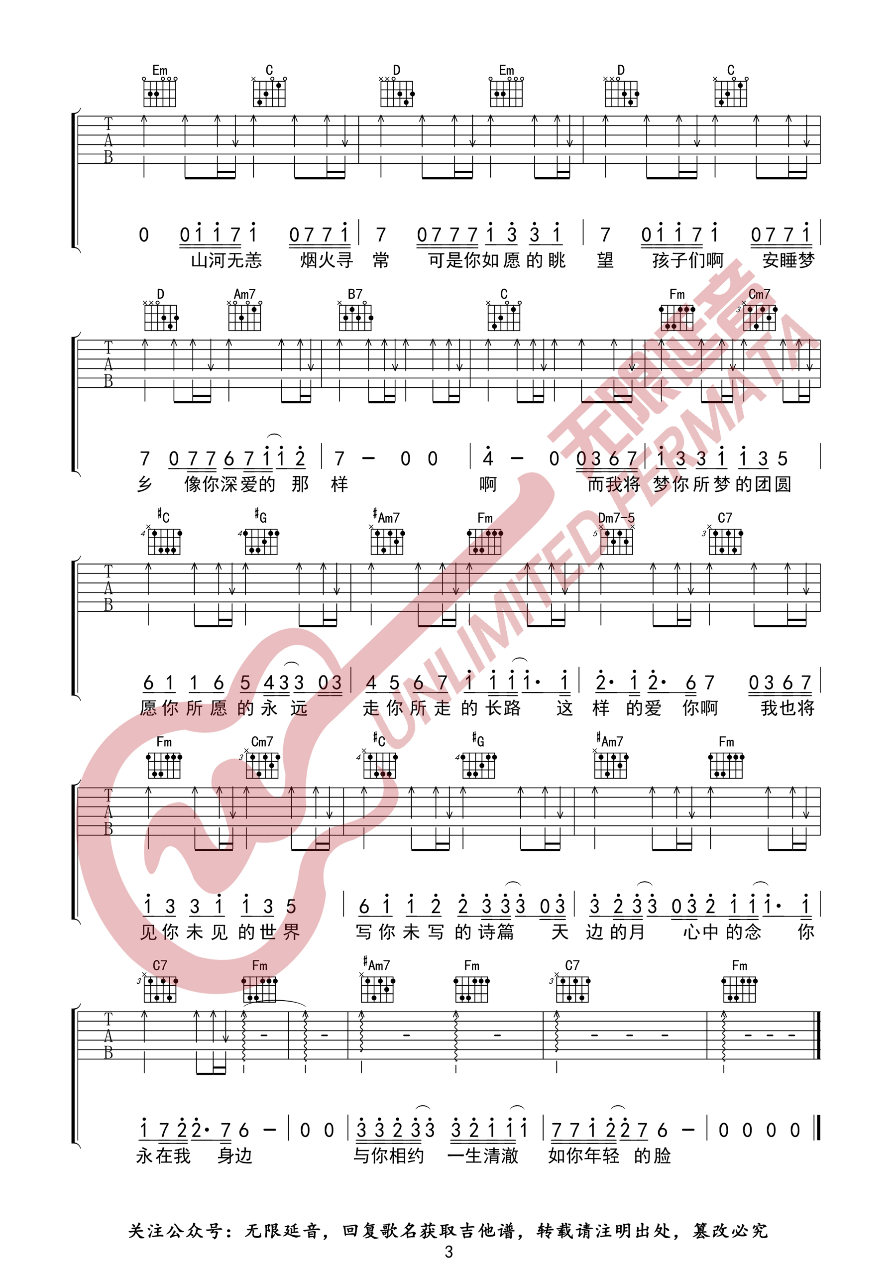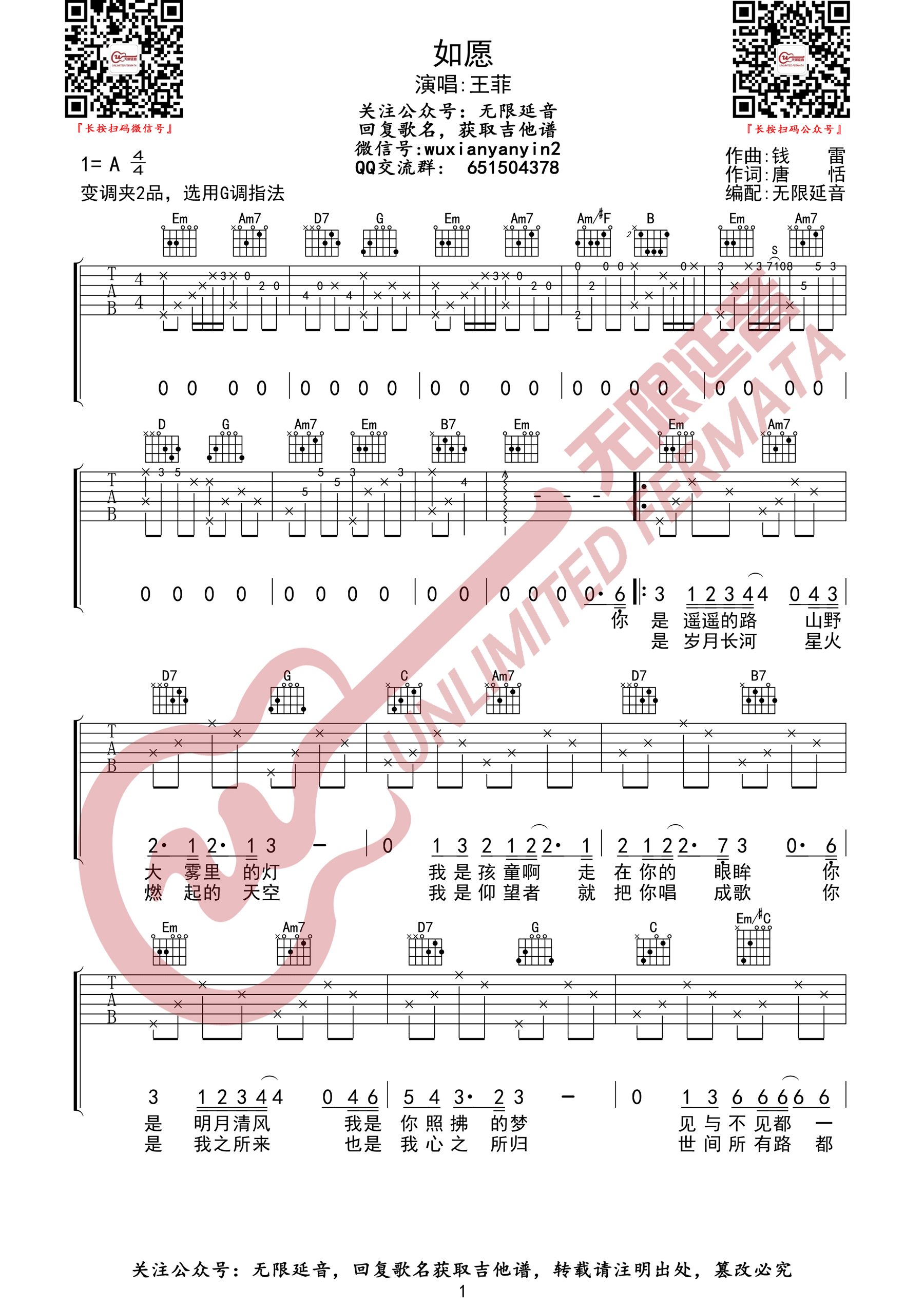 曲谱介绍: 王菲《如愿》吉他弹唱谱,采用G调指法编配原版,共有3张高清图谱。