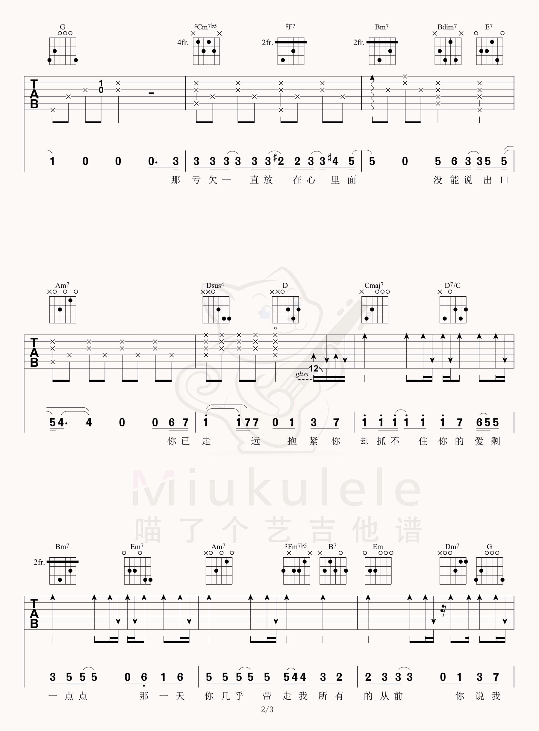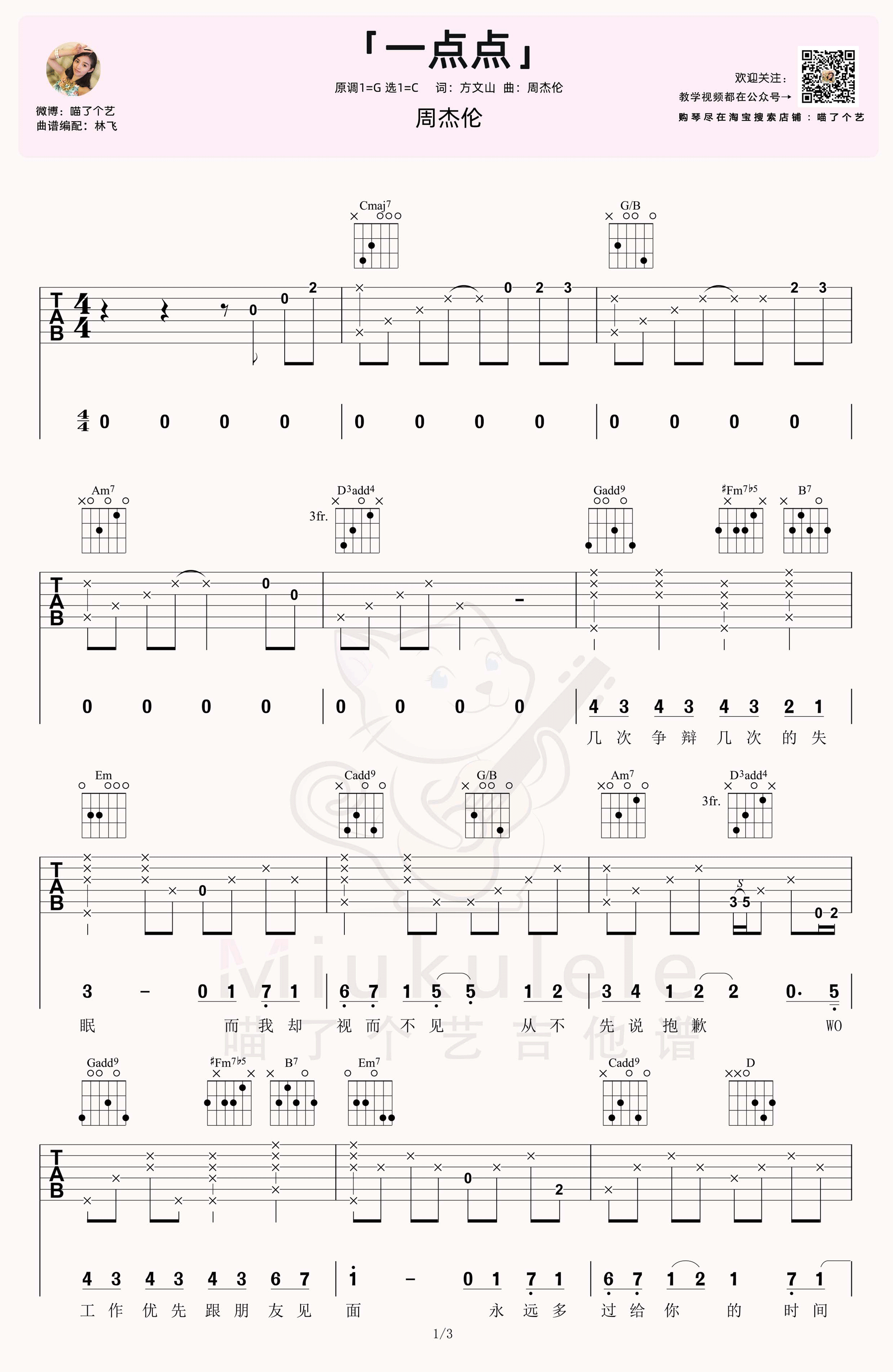 曲谱介绍: 周杰伦《一点点》吉他弹唱谱,采用C调指法编配,共有3张高清图谱。