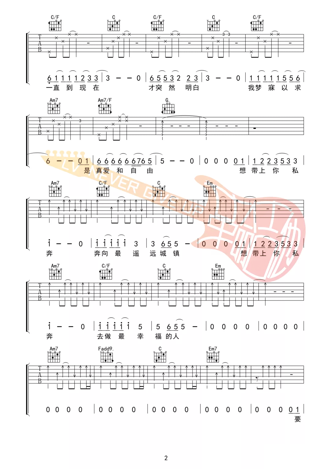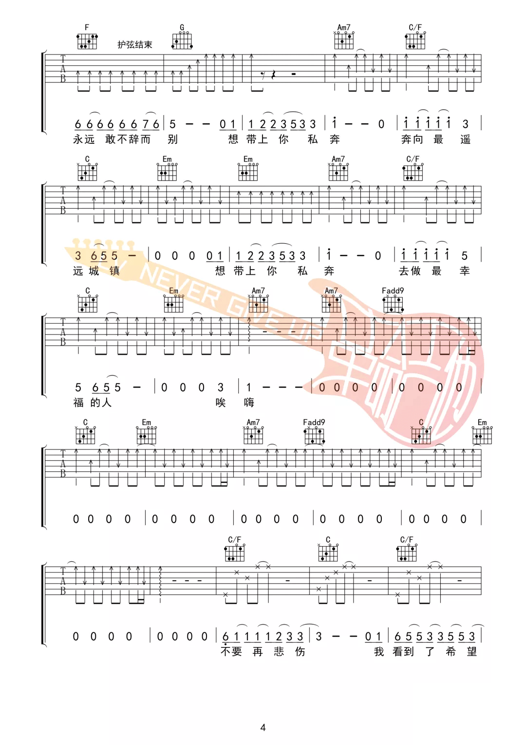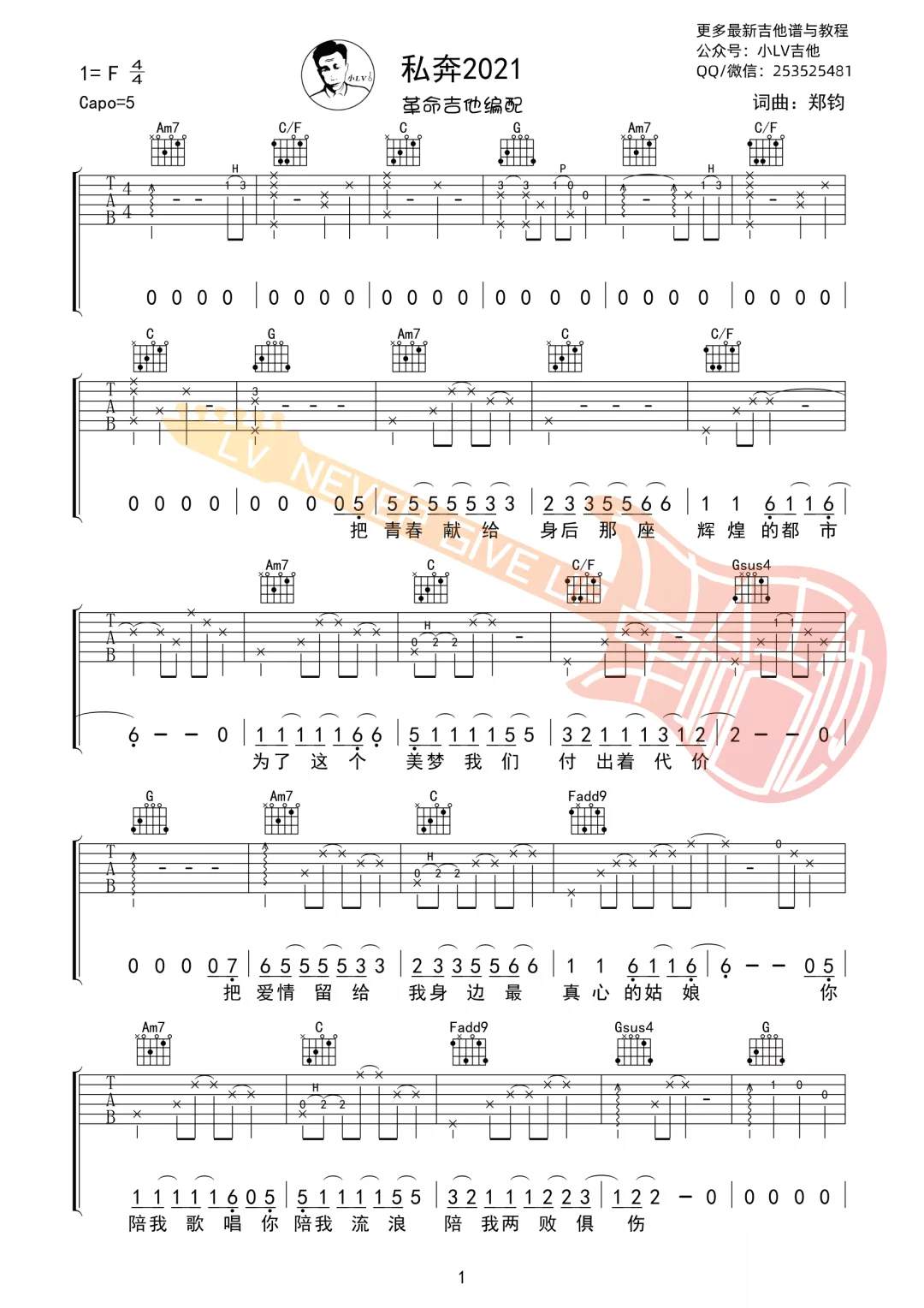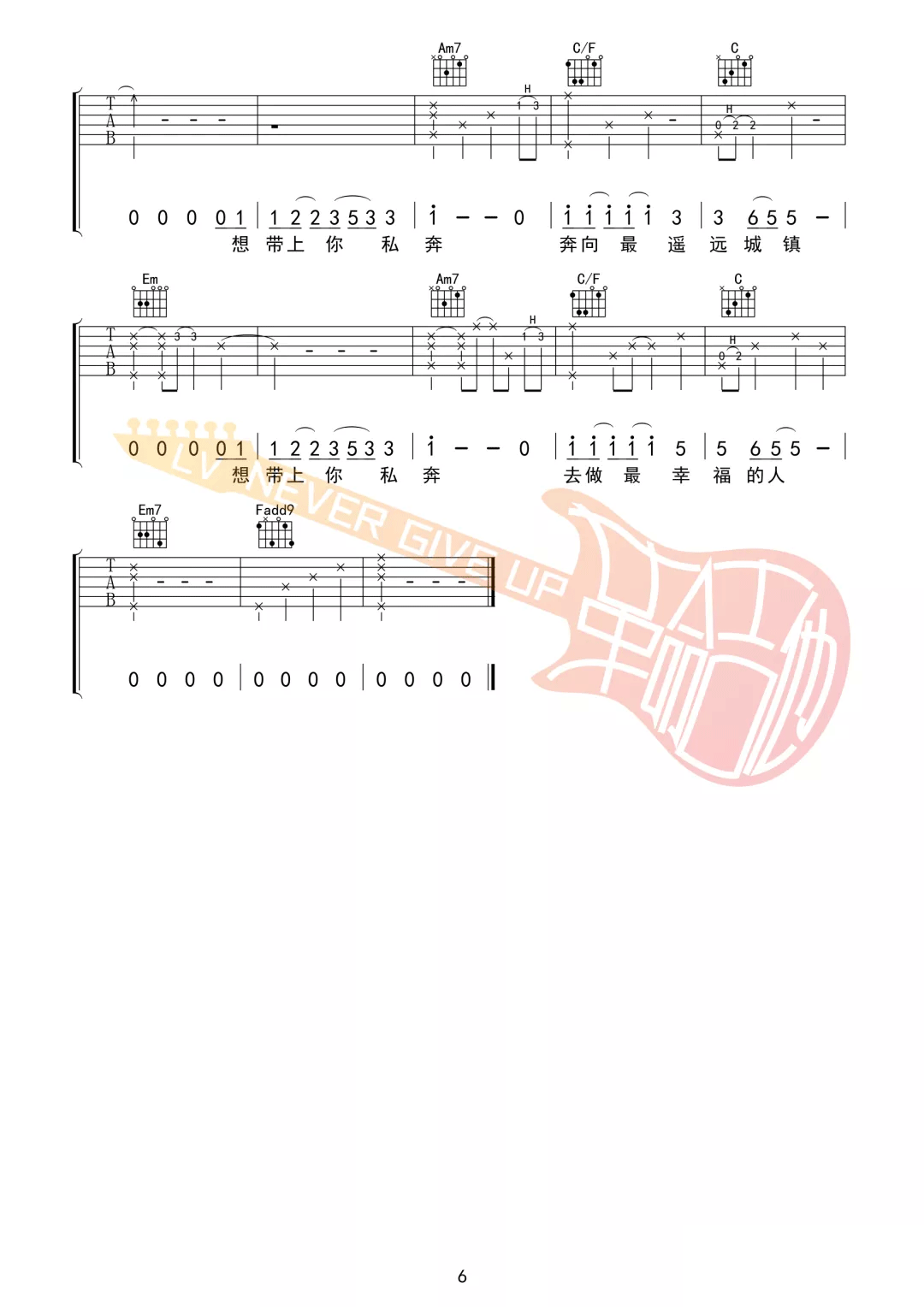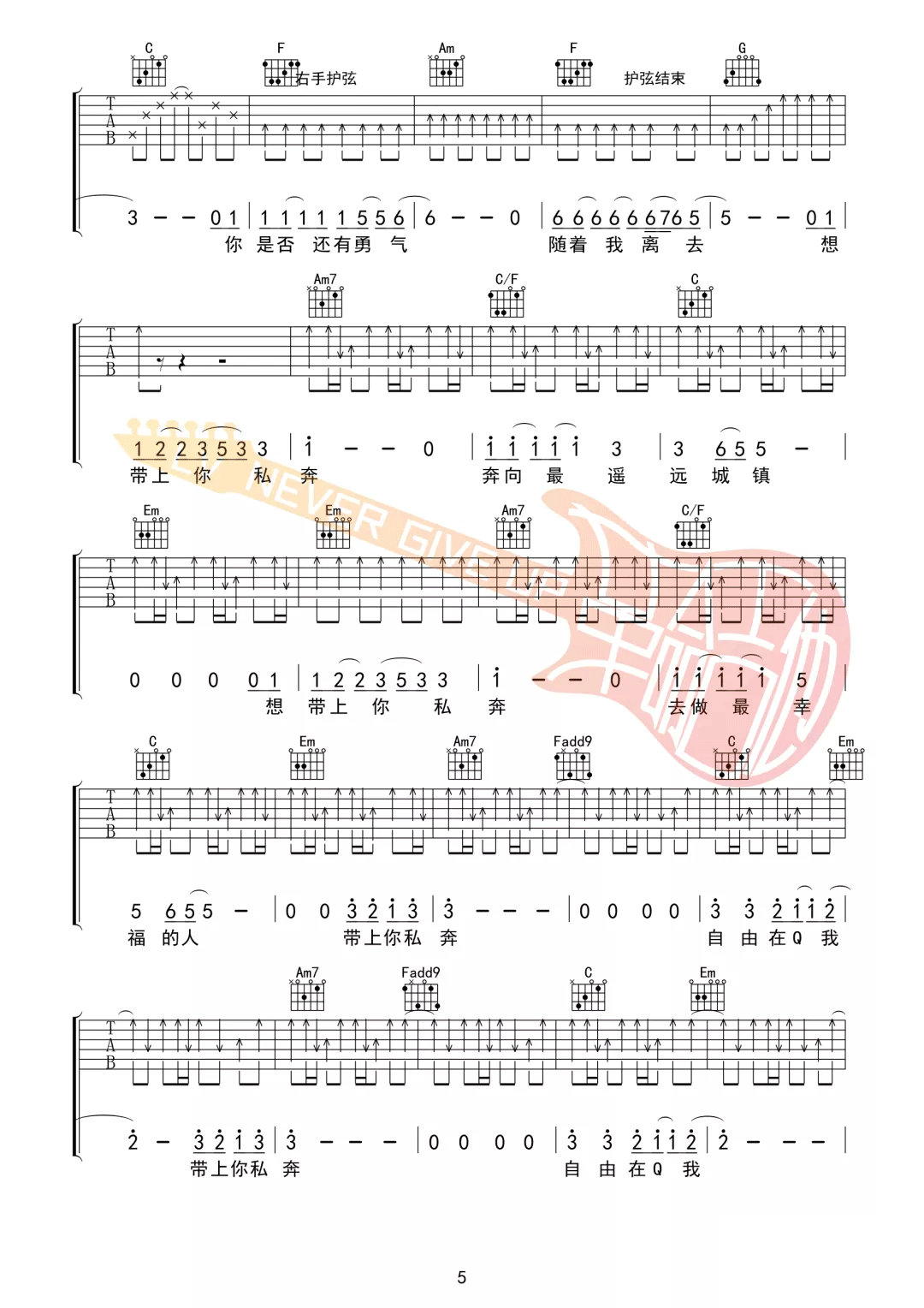 曲谱介绍: 郑钧《私奔》吉他弹唱谱,采用C调指法编配,共有6张高清图谱。