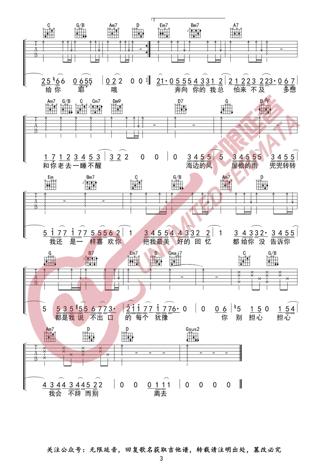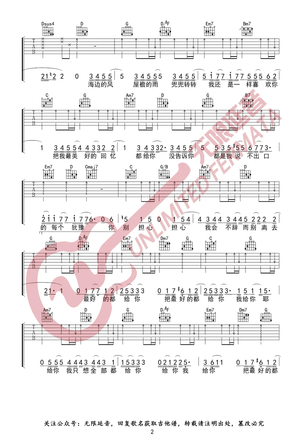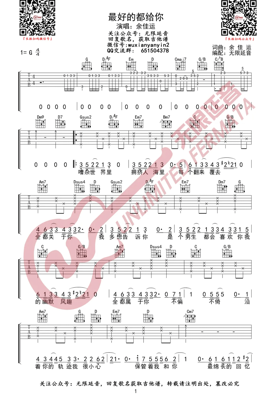 曲谱介绍: 余佳运《最好的都给你》吉他弹唱谱,采用G调指法编配原版,共有3张高清图谱。