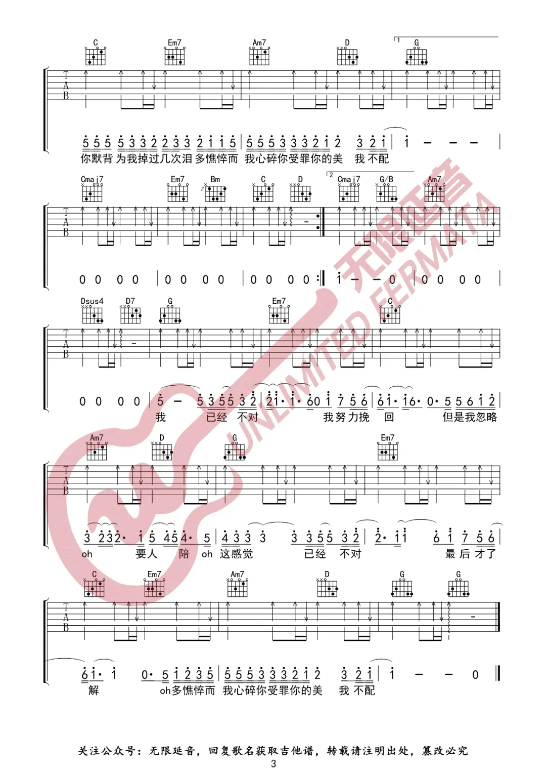 曲谱介绍: 周杰伦《我不配》吉他弹唱谱,采用G调指法编配原版,共有3张高清图谱。