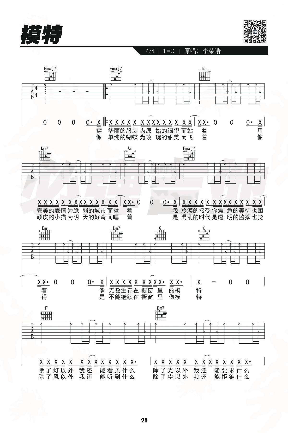 模特吉他谱 - 李荣浩 - C调吉他弹唱谱
