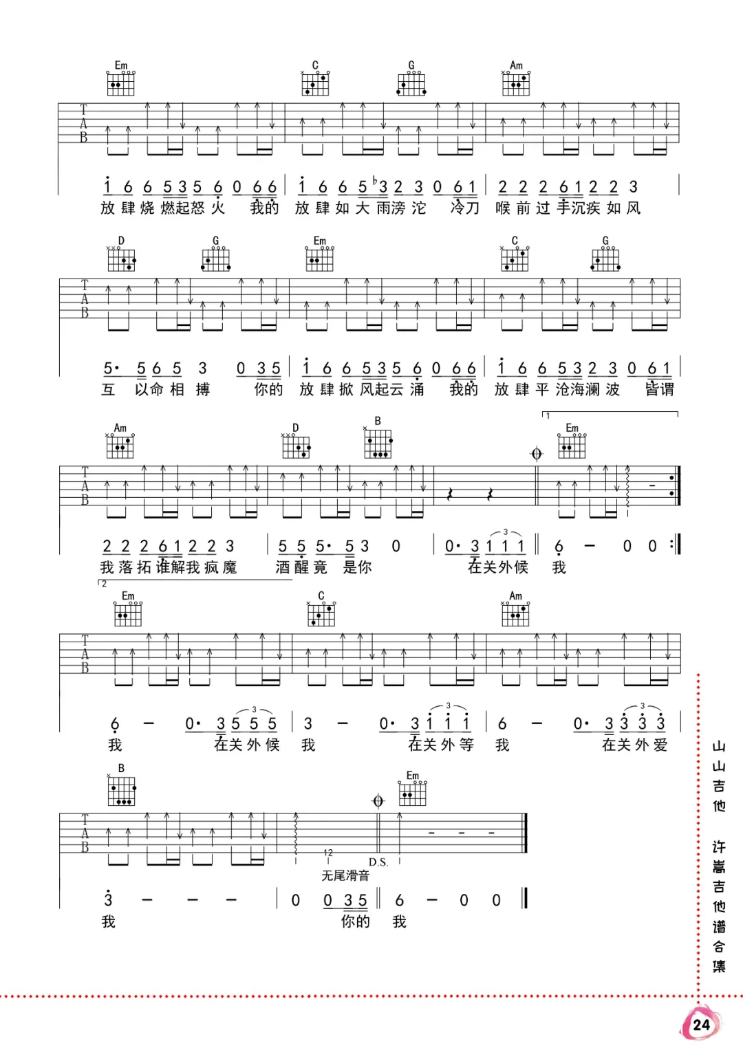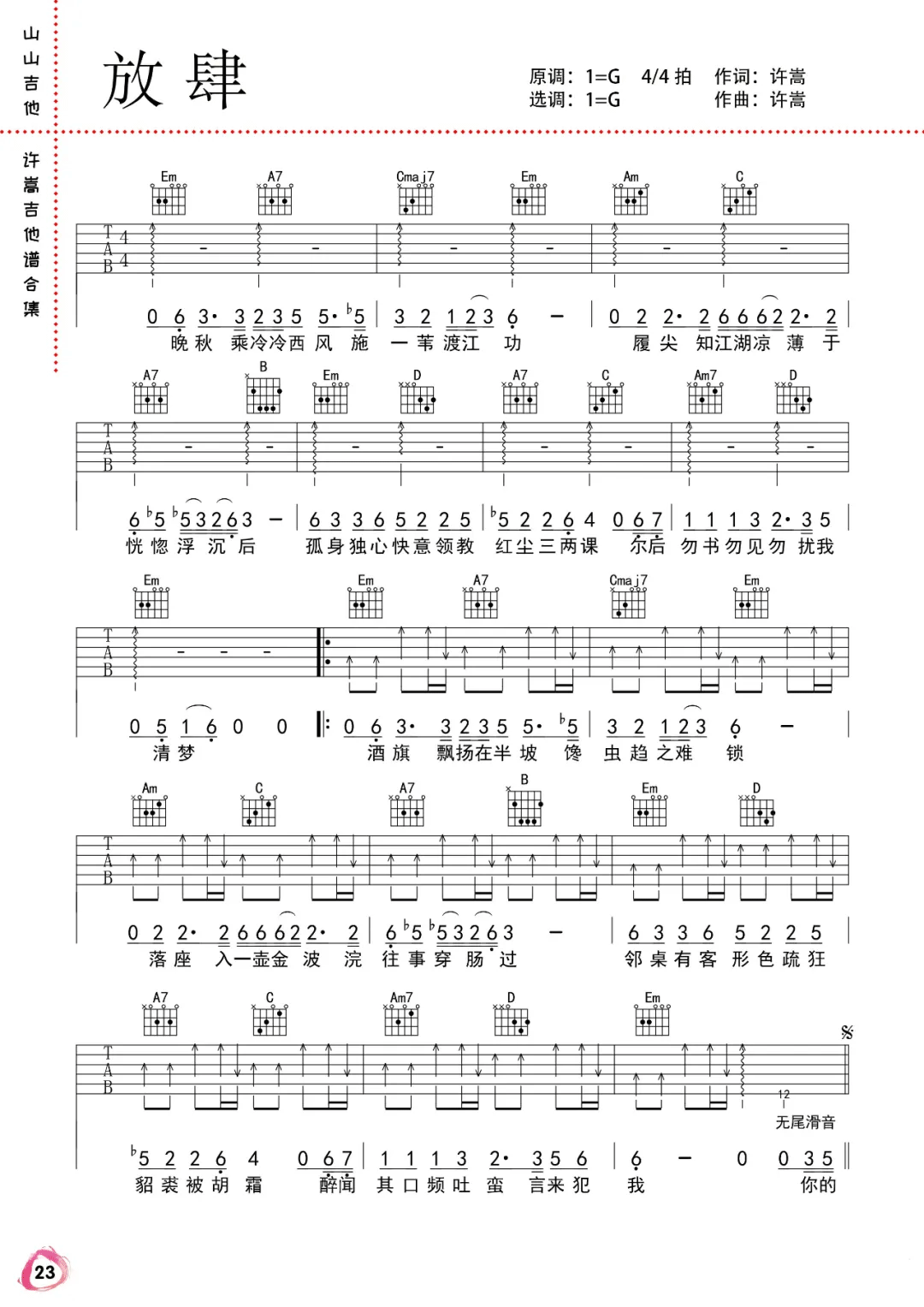 曲谱介绍: 许嵩《放肆》吉他弹唱谱,采用G调指法编配,共有2张高清图谱,免翻页排版设计。