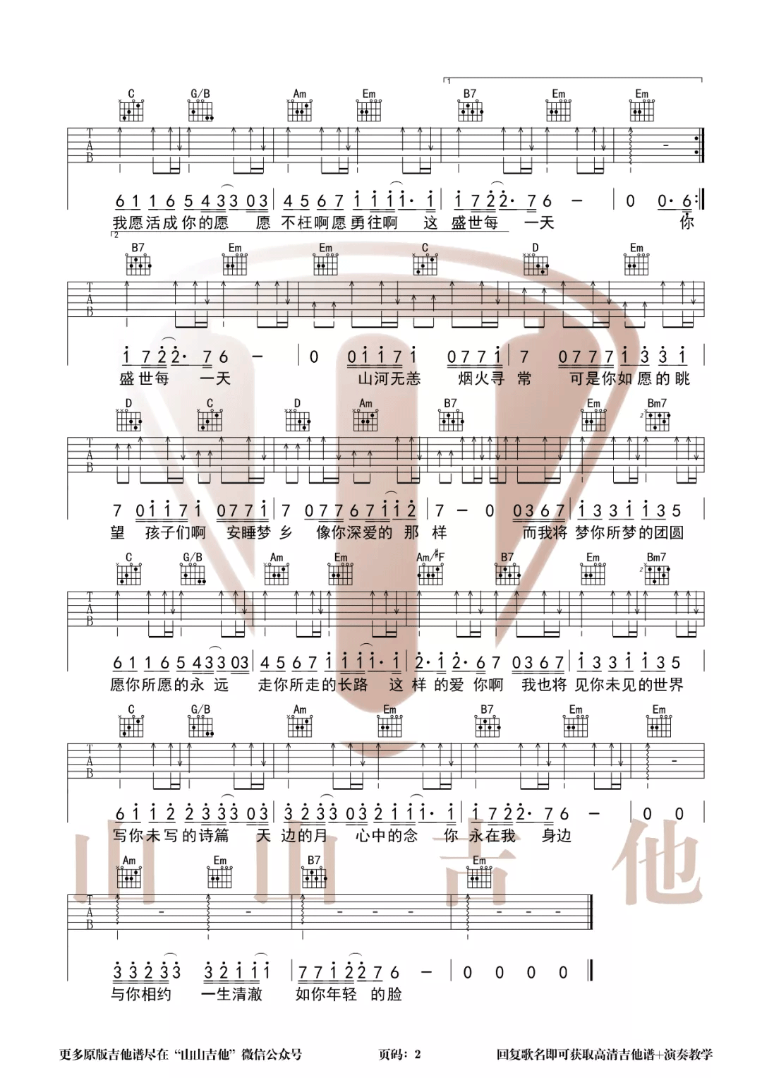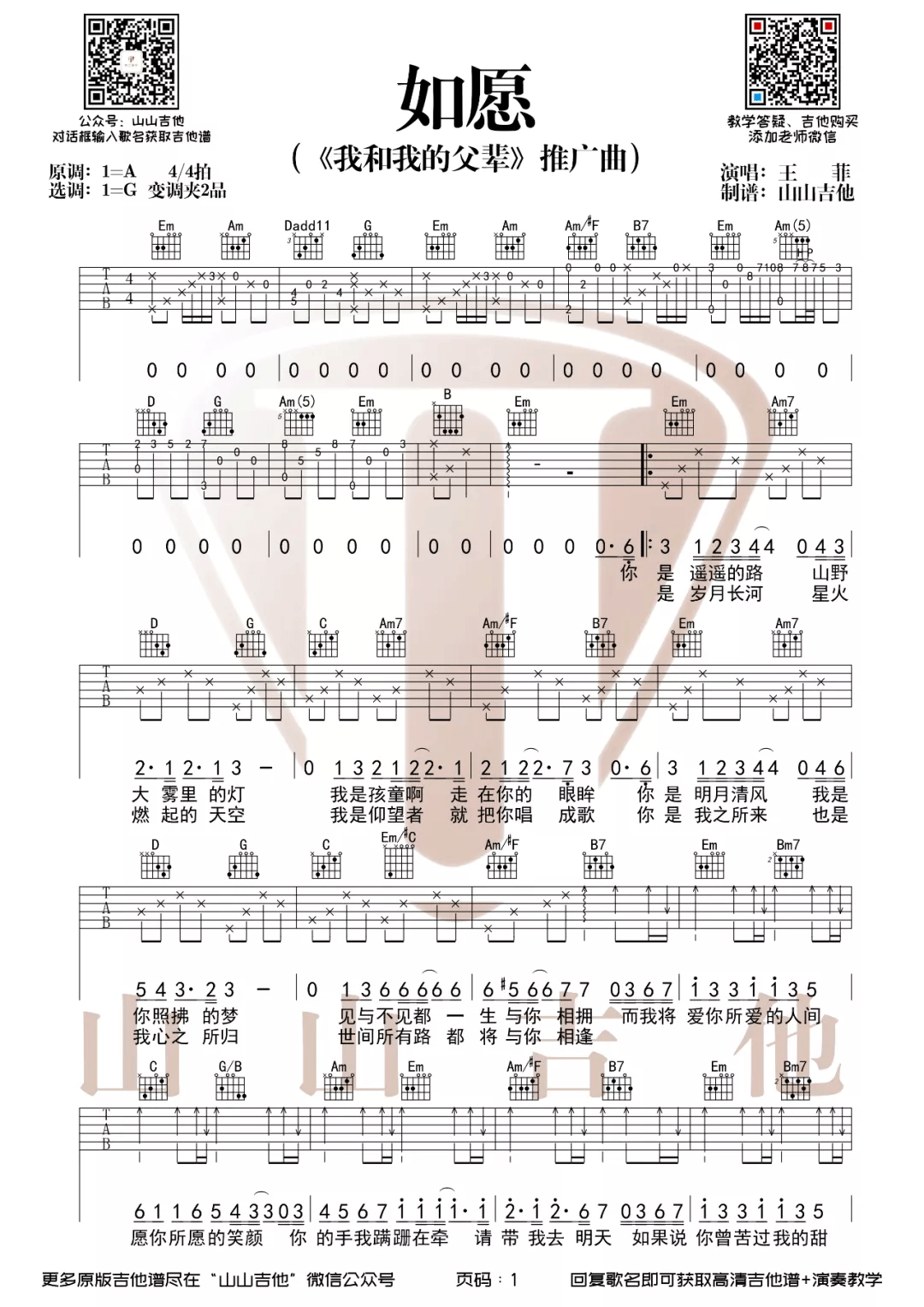曲谱介绍: 王菲《如愿》吉他弹唱谱,采用G调指法编配原版,共有2张高清图谱,免翻页排版设计。