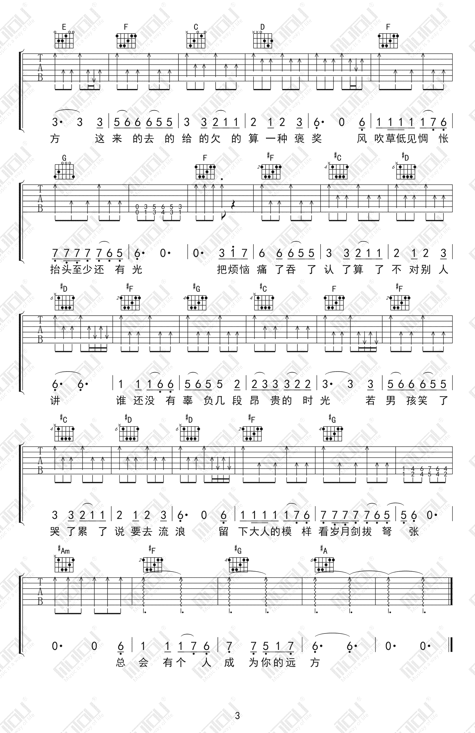 曲谱介绍: 毛不易《牧马城市》吉他弹唱谱,采用C调指法编配,共有3张高清图谱。