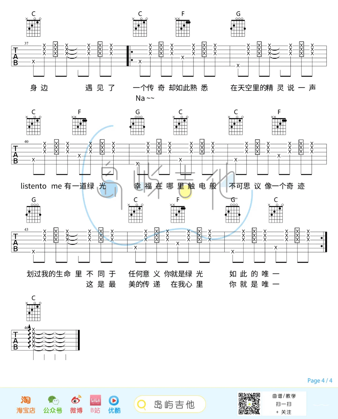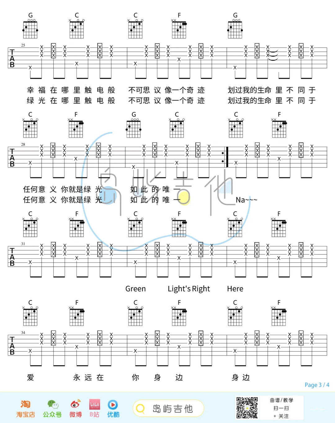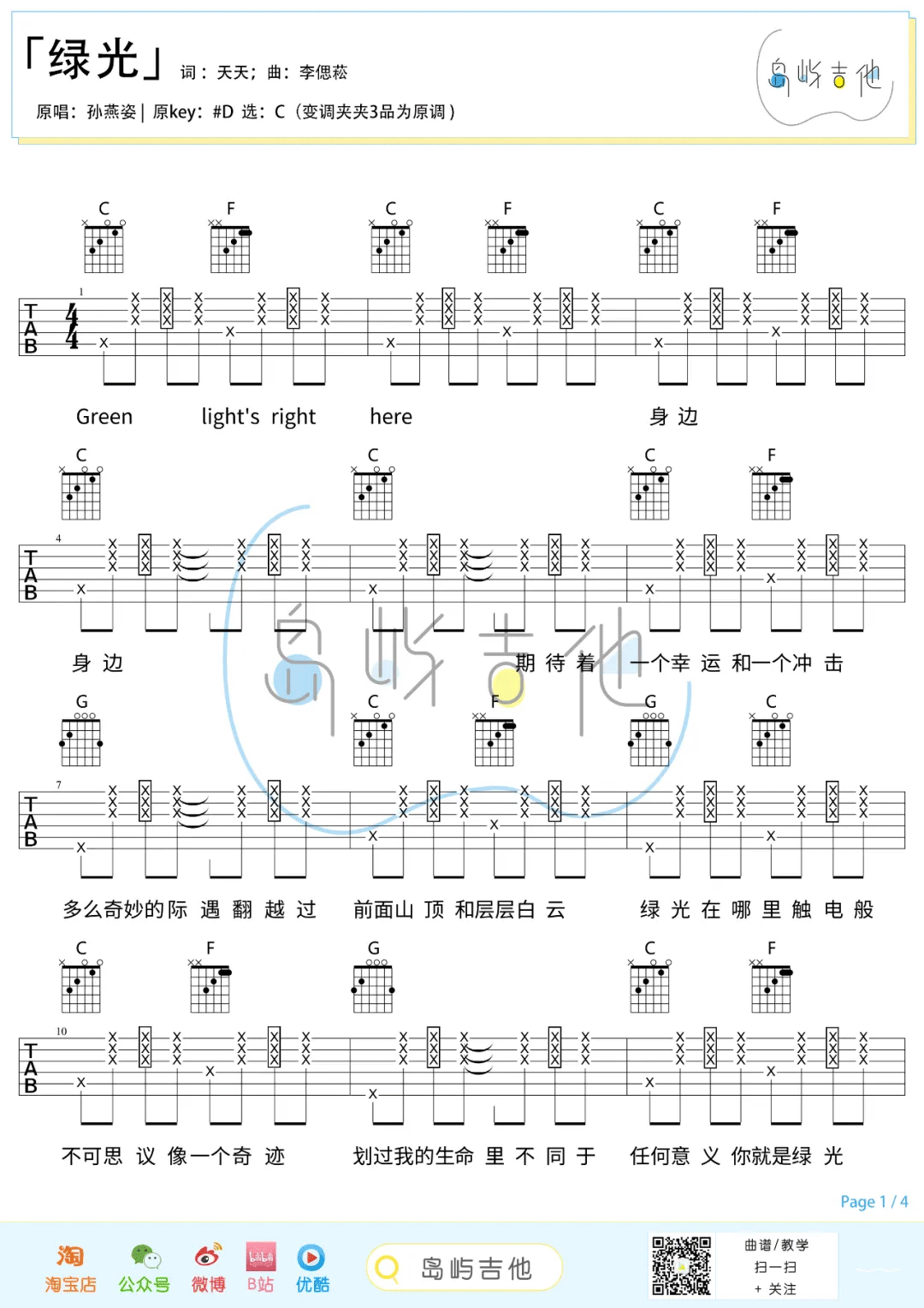 曲谱介绍: 孙燕姿《绿光》吉他弹唱谱,采用C调指法编配,共有4张高清图谱。