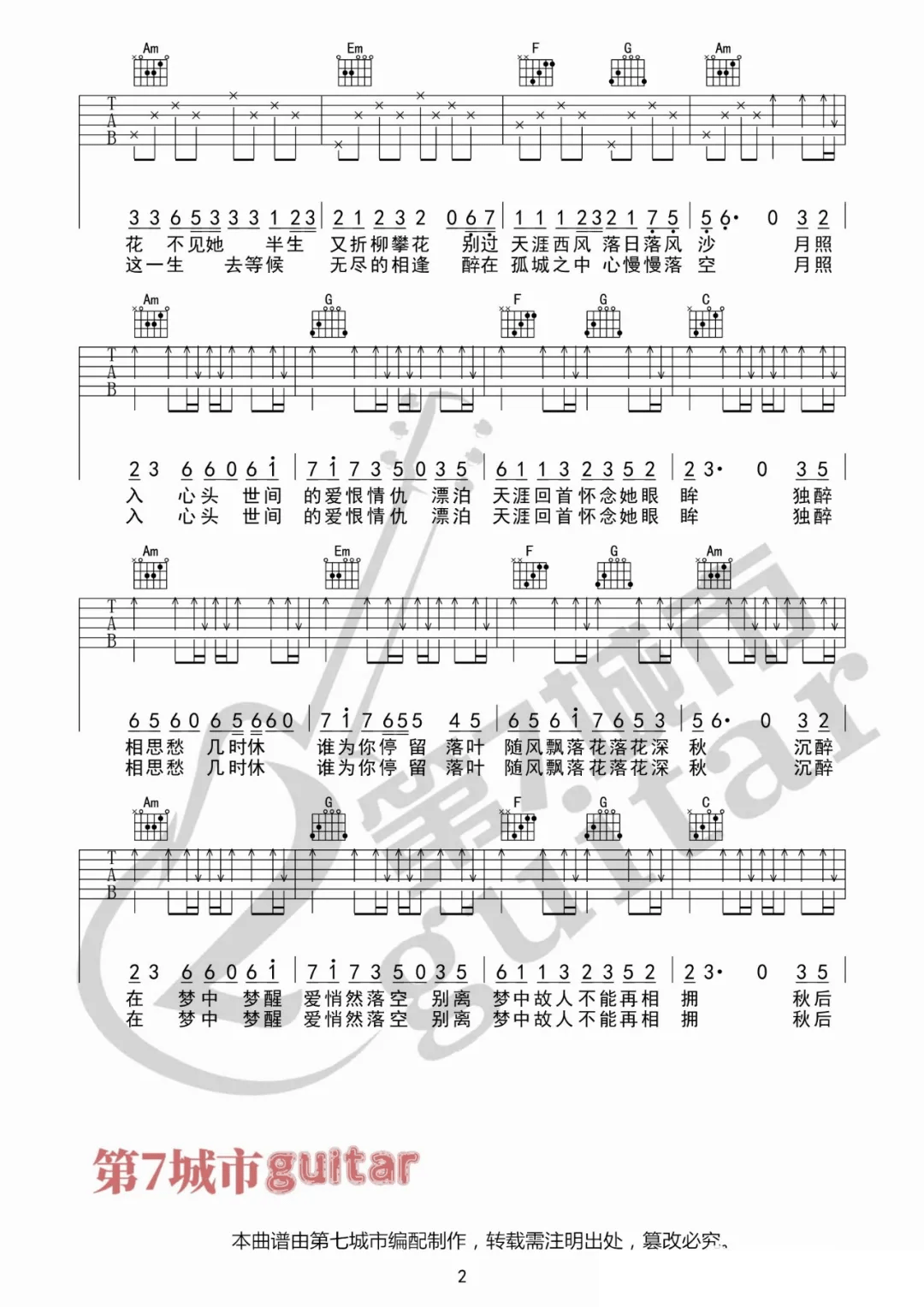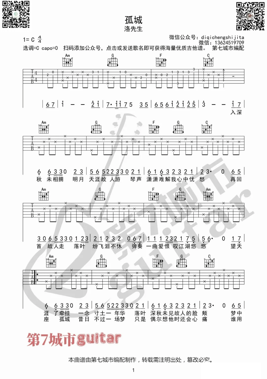曲谱介绍: 洛先生《孤城》吉他弹唱谱,采用C调指法编配原版,共有3张高清图谱。