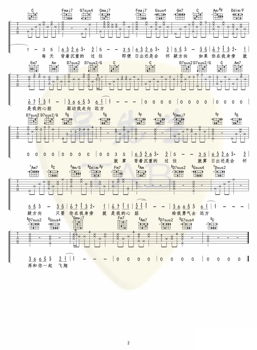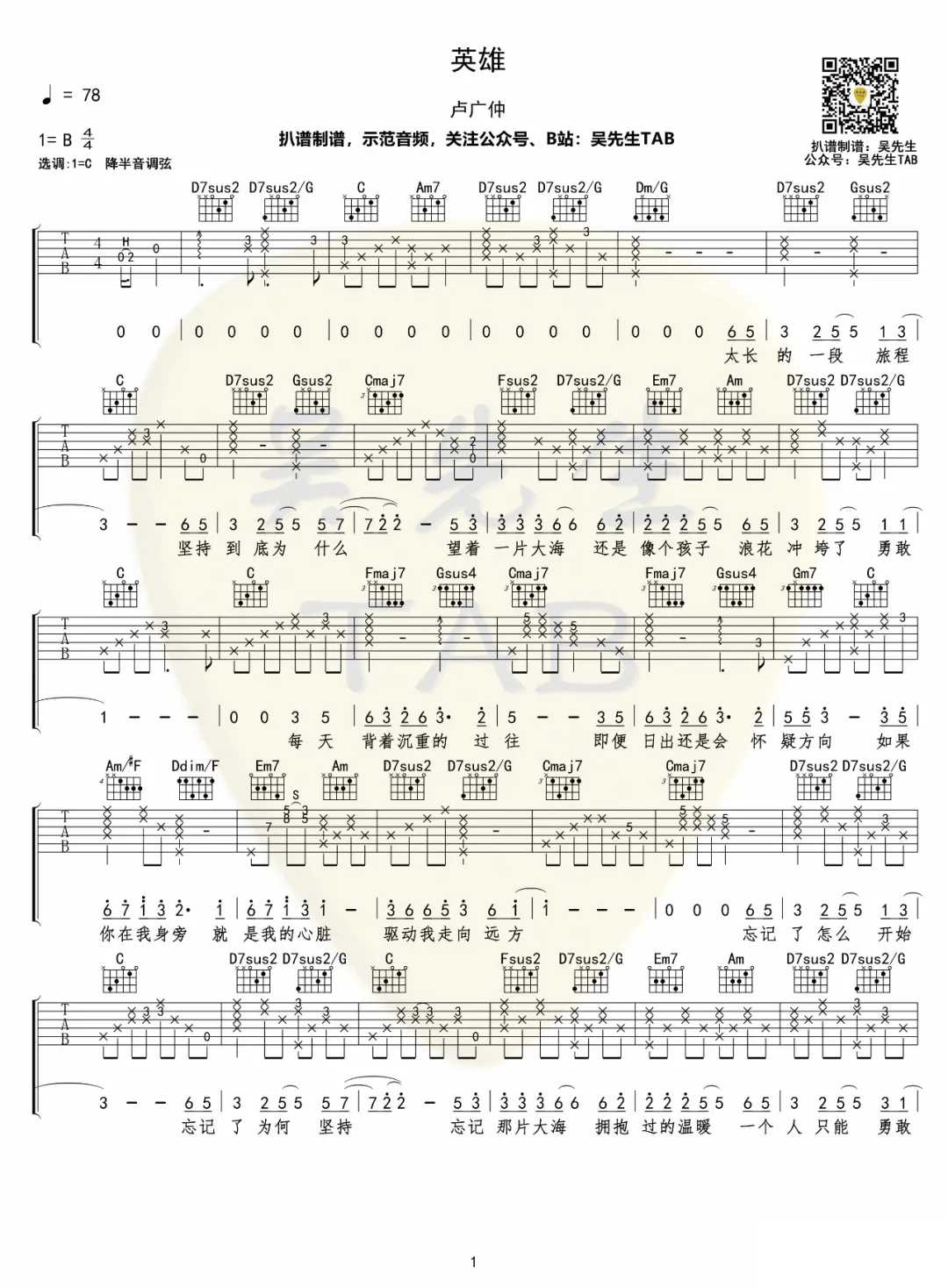 曲谱介绍: 卢广仲《英雄》吉他弹唱谱,采用C调指法编配原版,共有2张高清图谱,免翻页排版设计。
