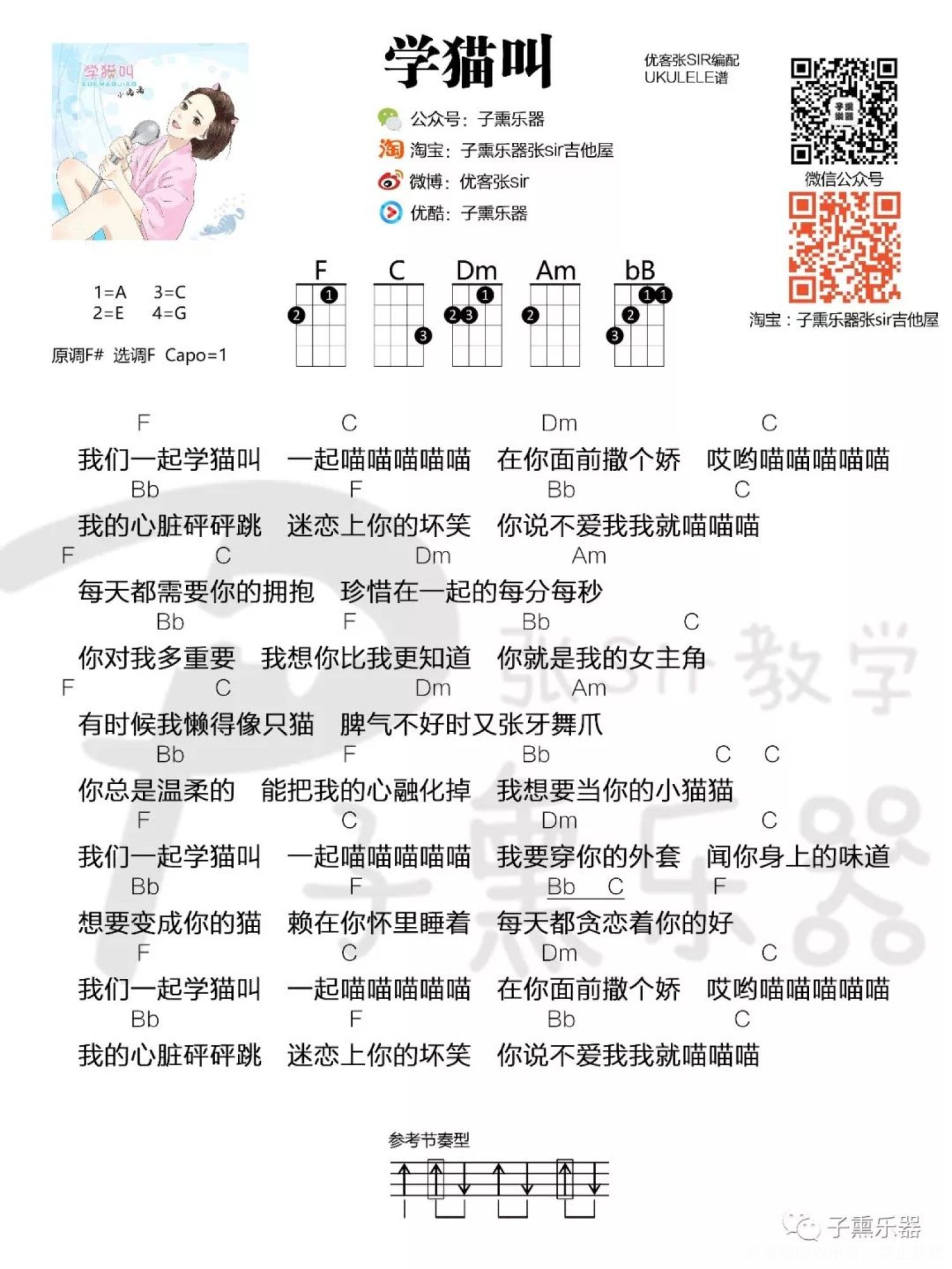 曲谱介绍: 小潘潘MV 《学猫叫》尤克里里弹唱谱