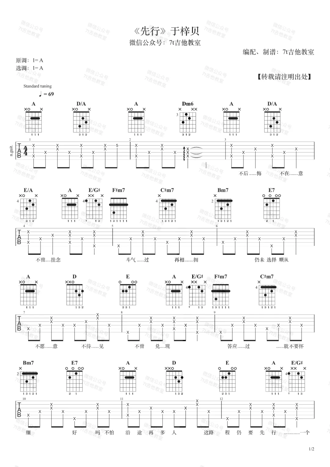 曲谱介绍: 于梓贝《先行》吉他弹唱谱,采用A调指法编配,共有2张高清图谱,免翻页排版设计。