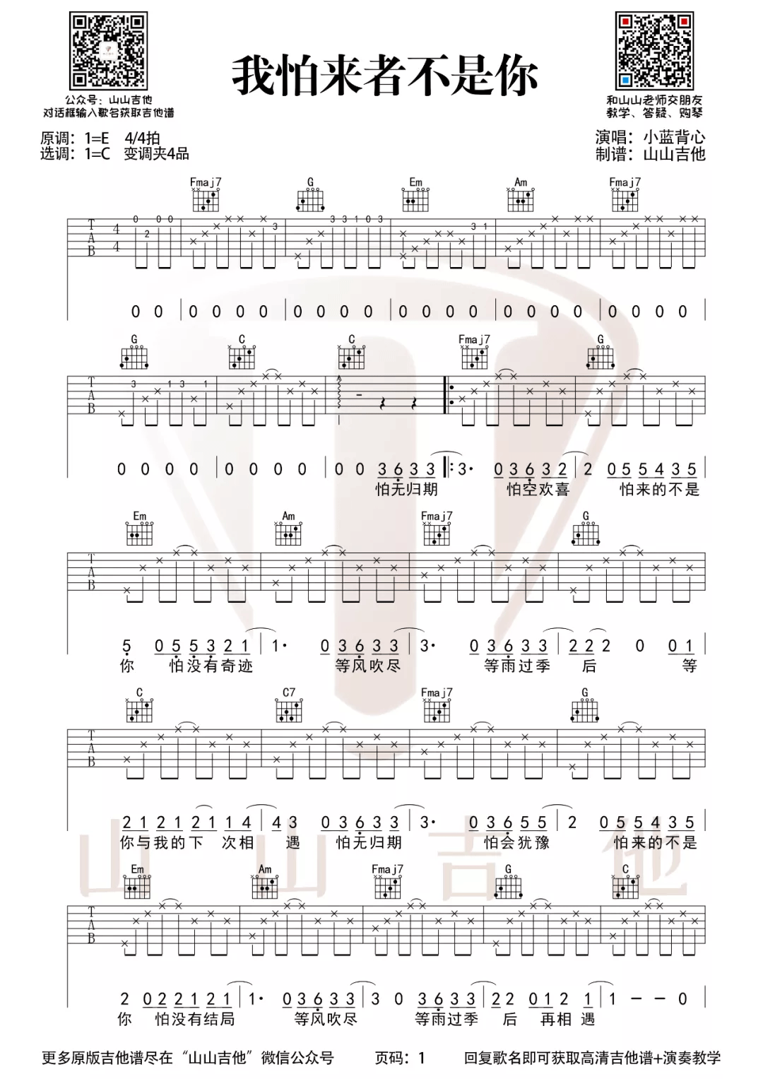 我怕来者不是你吉他谱 - 小蓝背心 - C调吉他弹唱谱