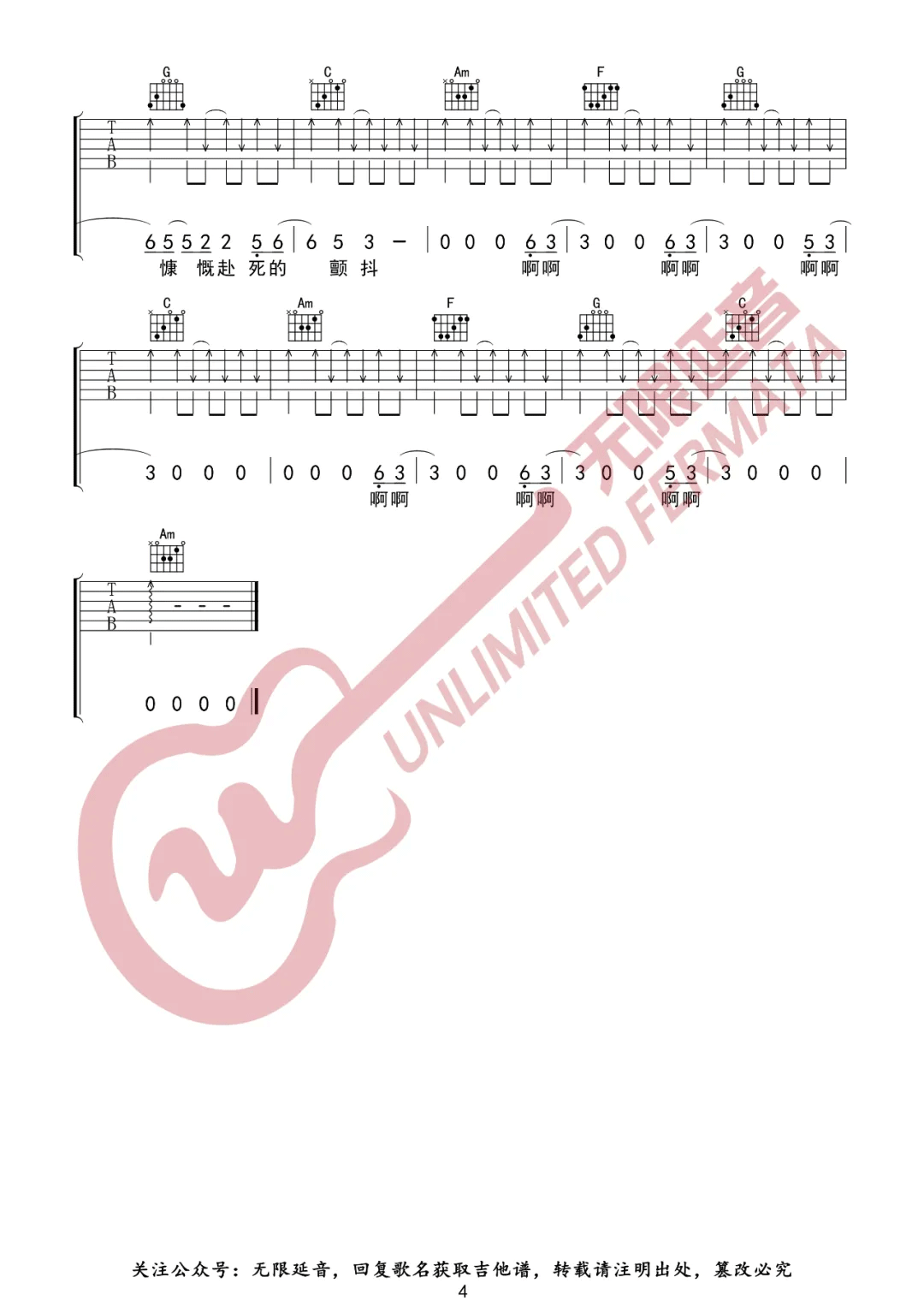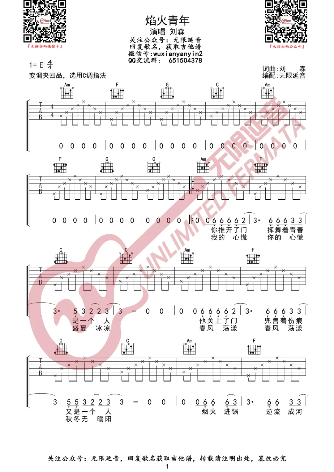 曲谱介绍: 刘森《焰火青年》吉他弹唱谱,采用C调指法编配,共有4张高清图谱。