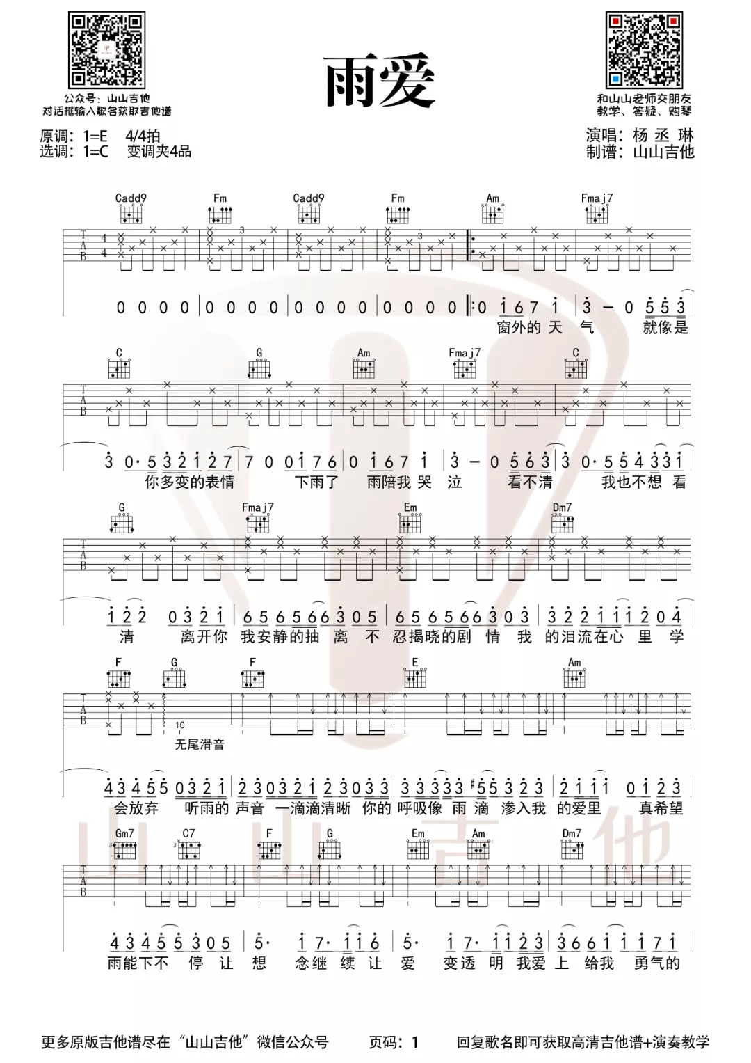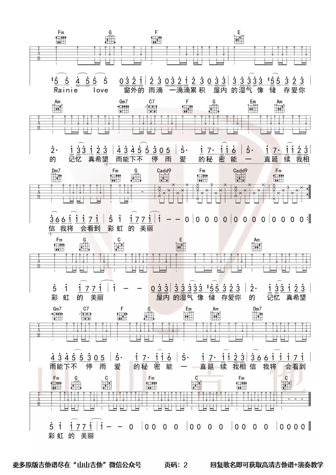 曲谱介绍: 杨丞琳《雨爱》吉他弹唱谱,采用C调指法编配原版,共有2张高清图谱,免翻页排版设计。