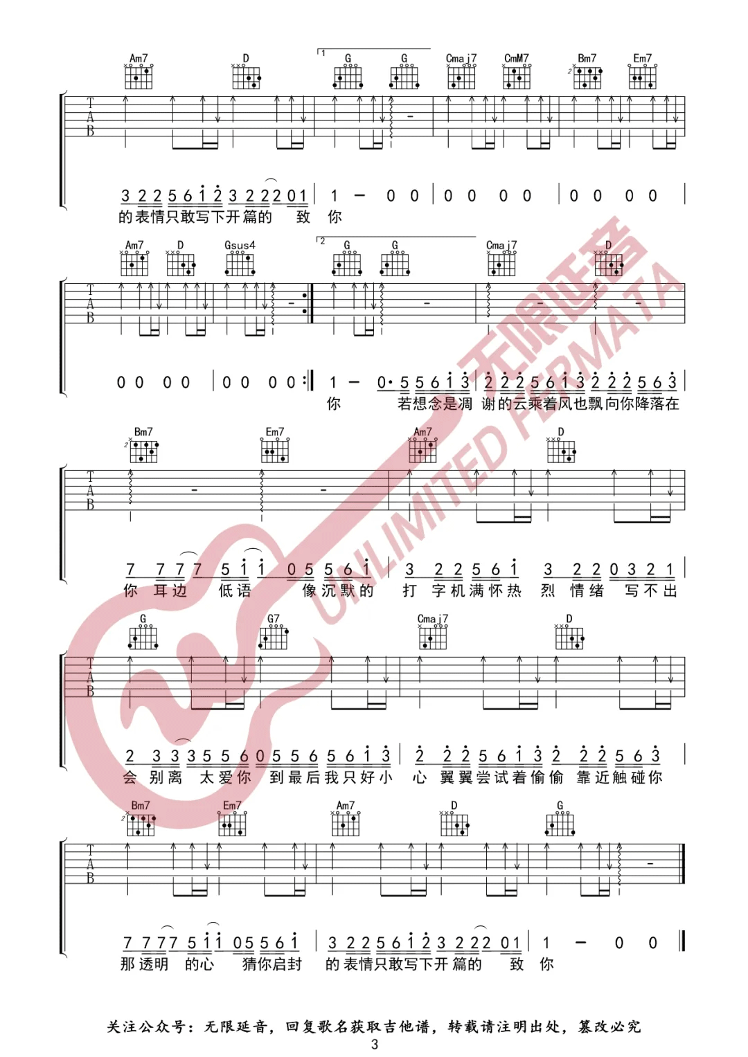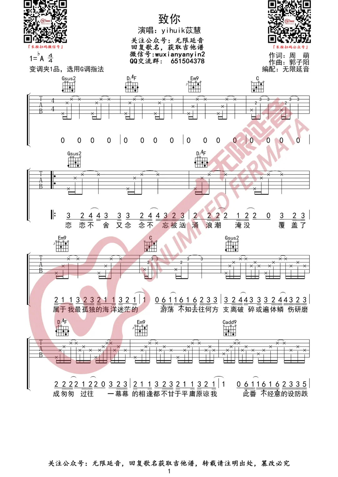 曲谱介绍: yihuik苡慧《致你》吉他弹唱谱,采用G调指法编配,共有3张高清图谱。