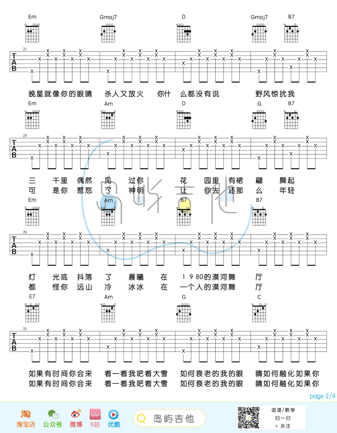 曲谱介绍: 柳爽《漠河舞厅》吉他弹唱谱,采用G调指法编配,共有4张高清图谱。