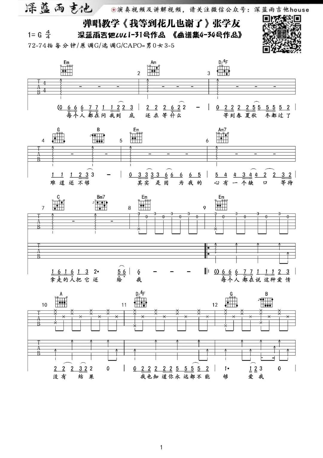 曲谱介绍: 张学友《我等到花儿也谢了》吉他弹唱谱,采用G调指法编配,共有3张高清图谱。