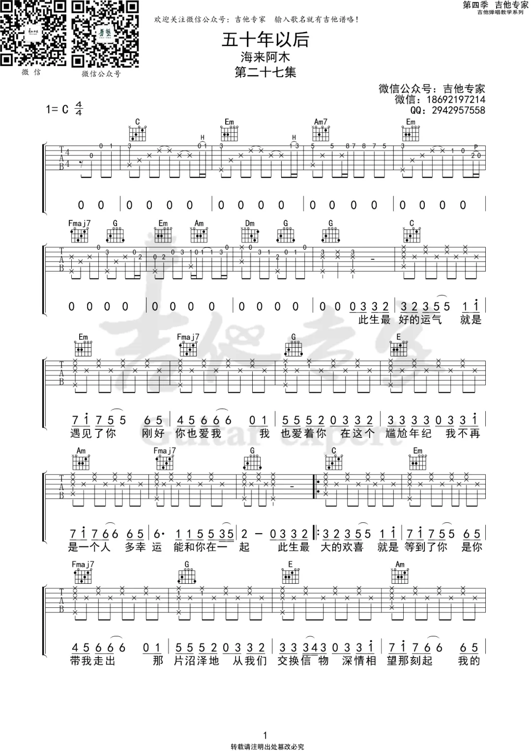 曲谱介绍: 海来阿木《五十年以后》吉他弹唱谱,采用C调指法编配,共有3张高清图谱。