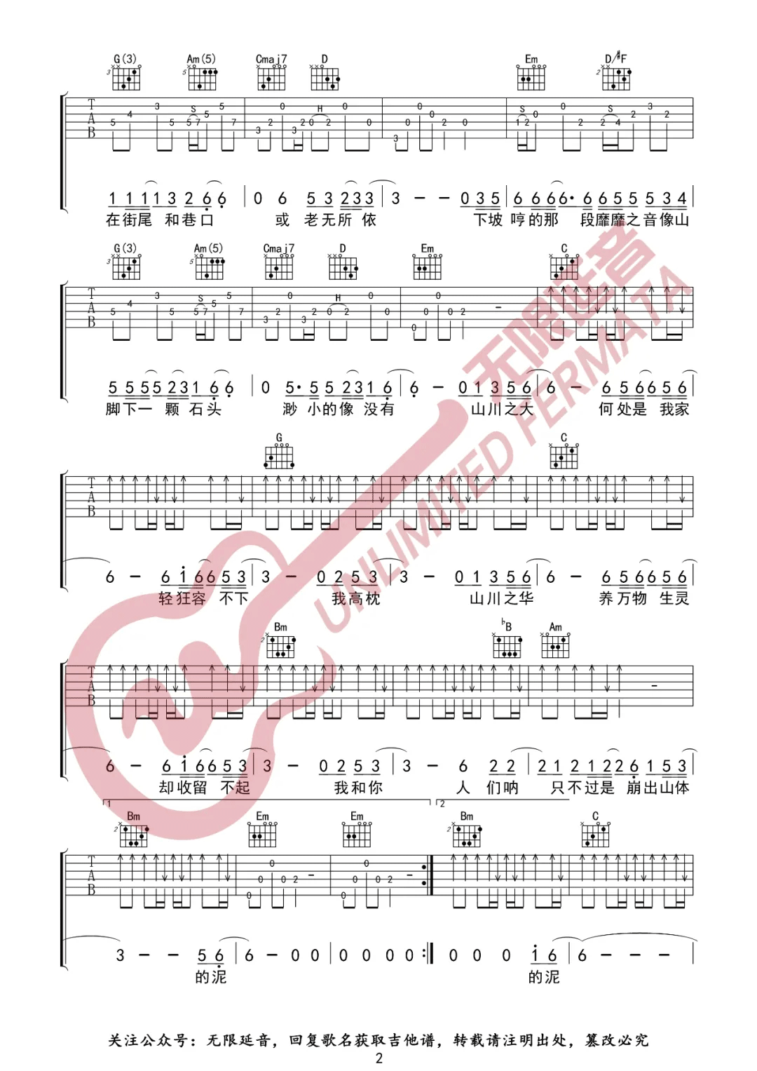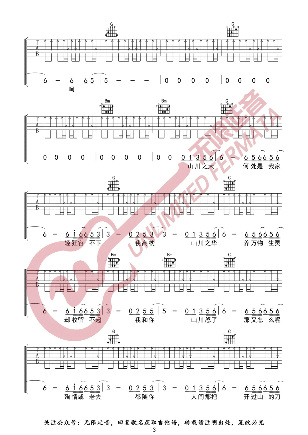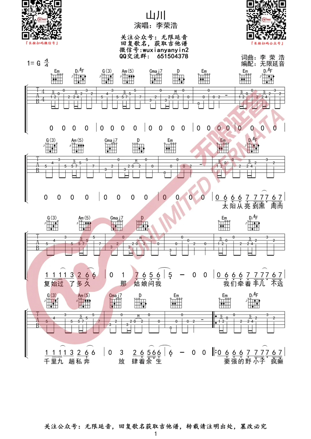 曲谱介绍: 李荣浩《山川》吉他弹唱谱,采用G调指法编配,共有3张高清图谱。