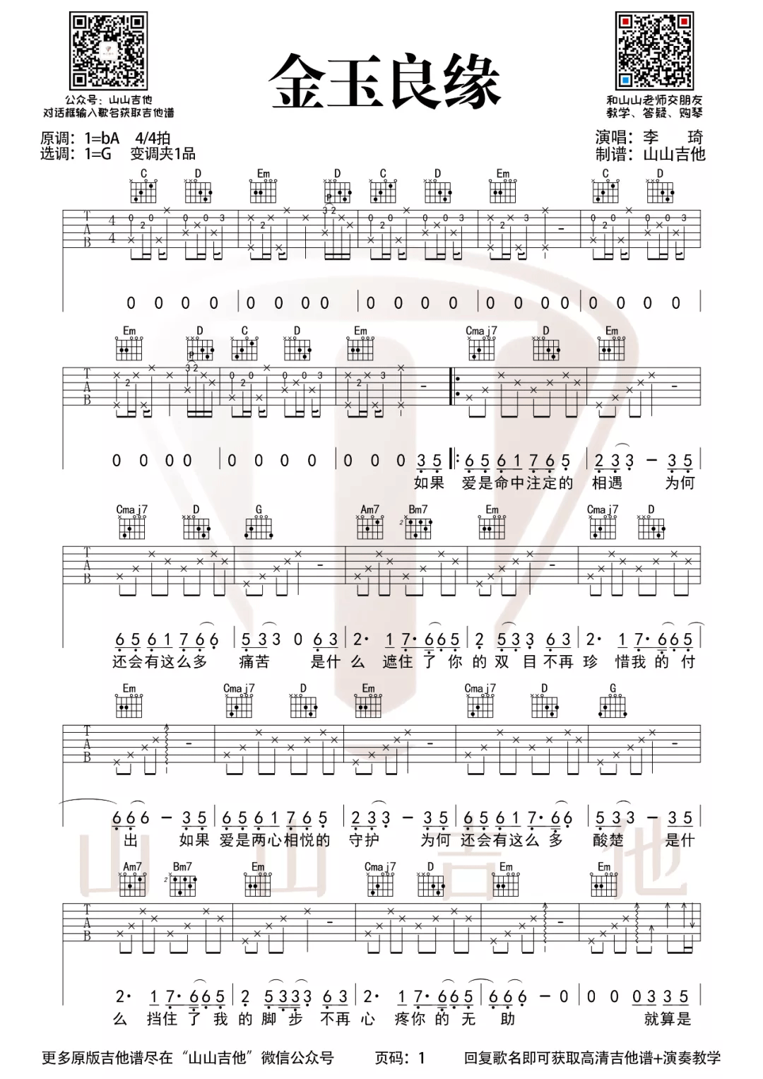曲谱介绍: 付雪/李琦《金玉良缘》吉他弹唱谱,采用G调指法编配,共有2张高清图谱,免翻页排版设计。