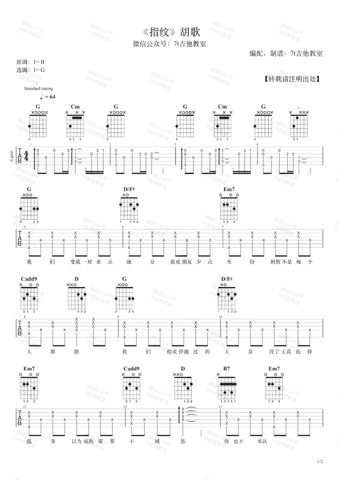 曲谱介绍: 胡歌《指纹》吉他弹唱谱,采用G调指法编配,共有2张高清图谱,免翻页排版设计。