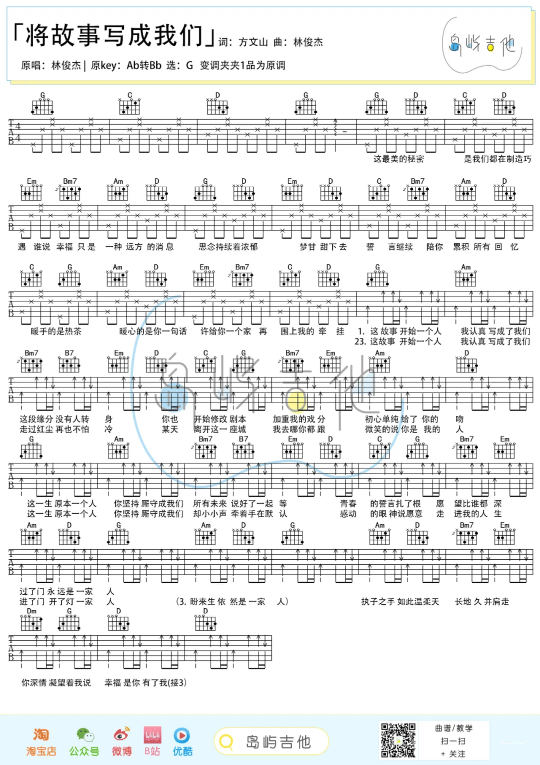 曲谱介绍: 林俊杰《将故事写成我们》吉他弹唱谱,采用G调指法编配,共有2张高清图谱,免翻页排版设计。