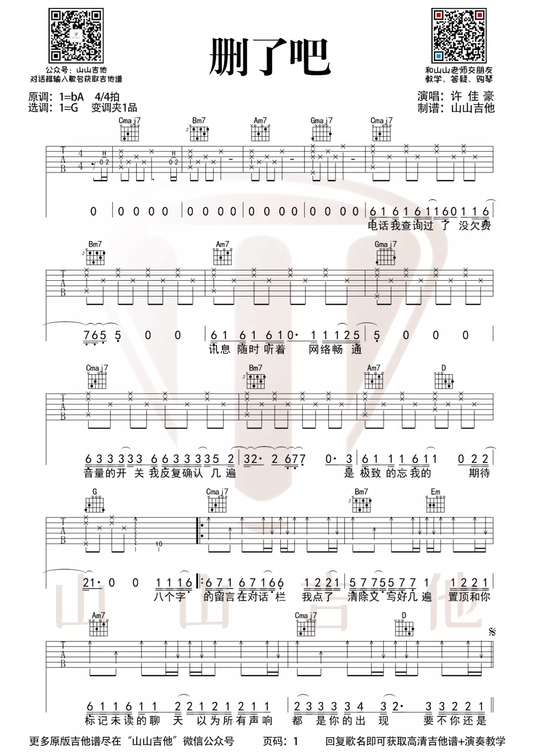 曲谱介绍: 许佳豪《删了吧》吉他弹唱谱,采用G调指法编配,共有2张高清图谱,免翻页排版设计。
