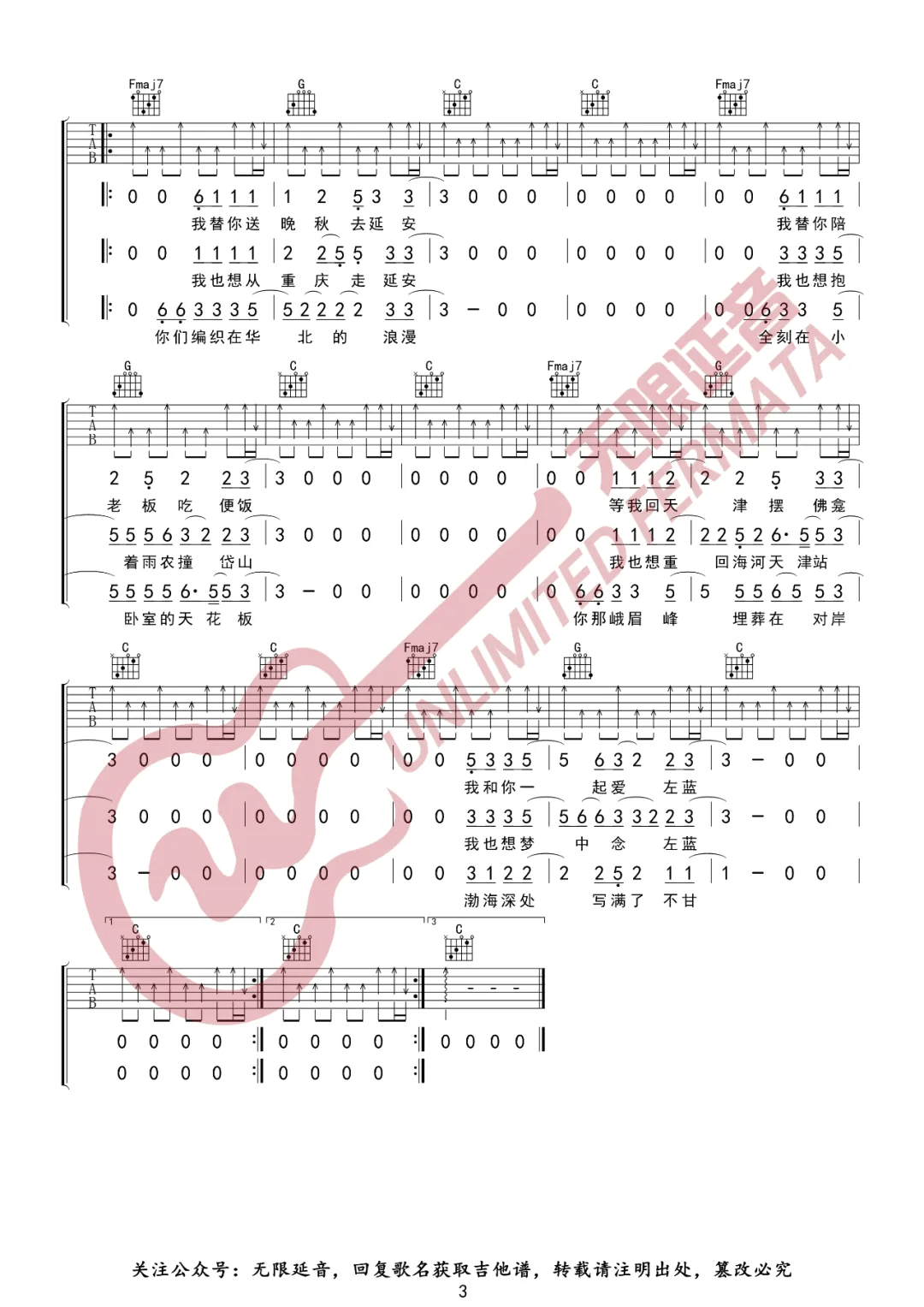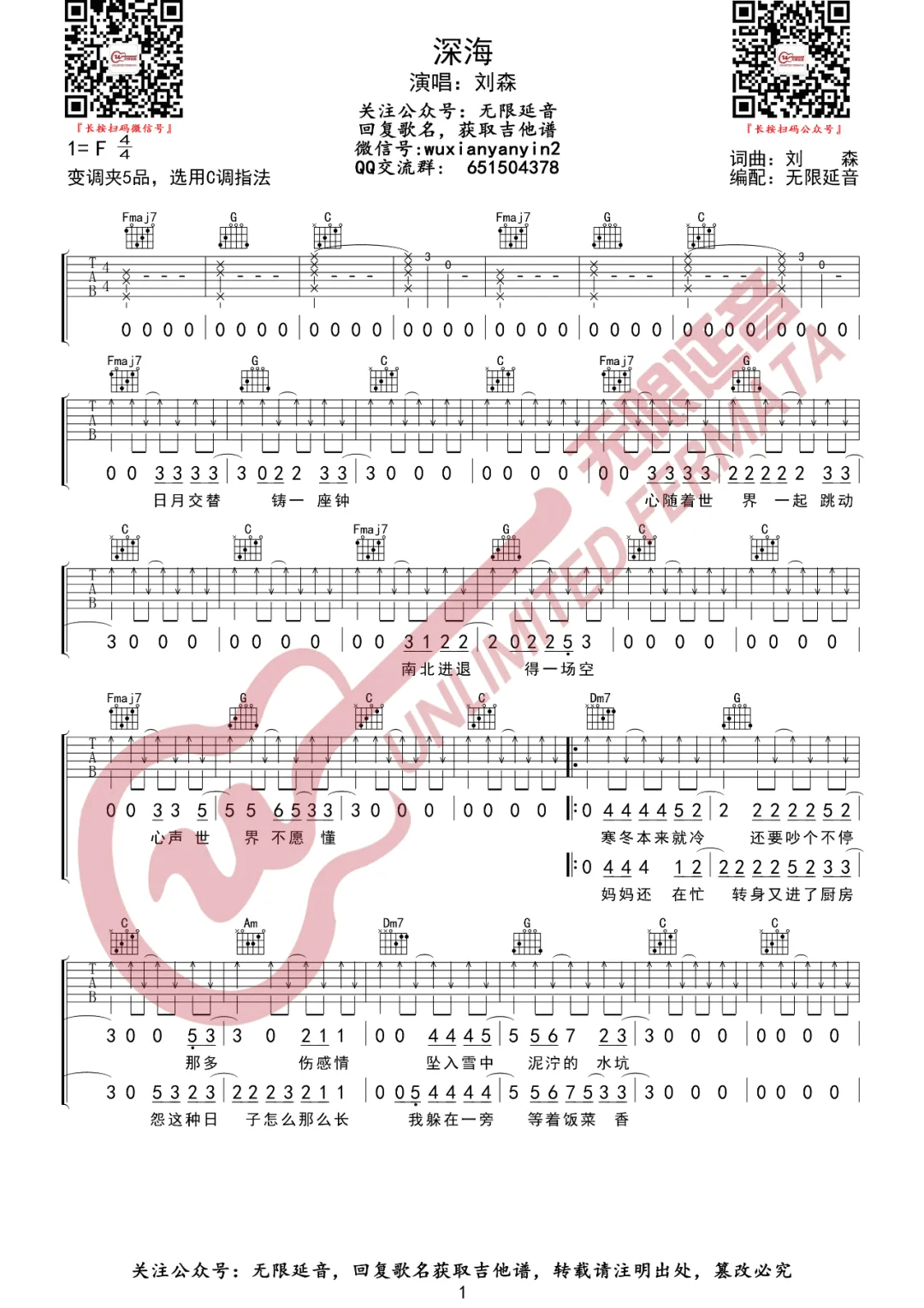 曲谱介绍: 刘森《深海》吉他弹唱谱,采用C调指法编配,共有3张高清图谱。