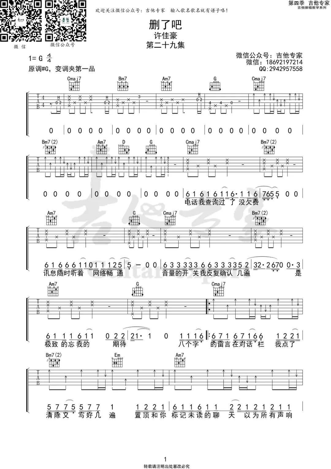 曲谱介绍: 烟(许佳豪)《删了吧》吉他弹唱谱,采用G调指法编配,共有3张高清图谱。
