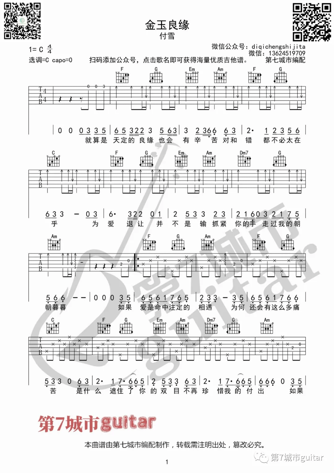 曲谱介绍: 付雪《金玉良缘》吉他弹唱谱,采用C调指法编配,共有3张高清图谱。