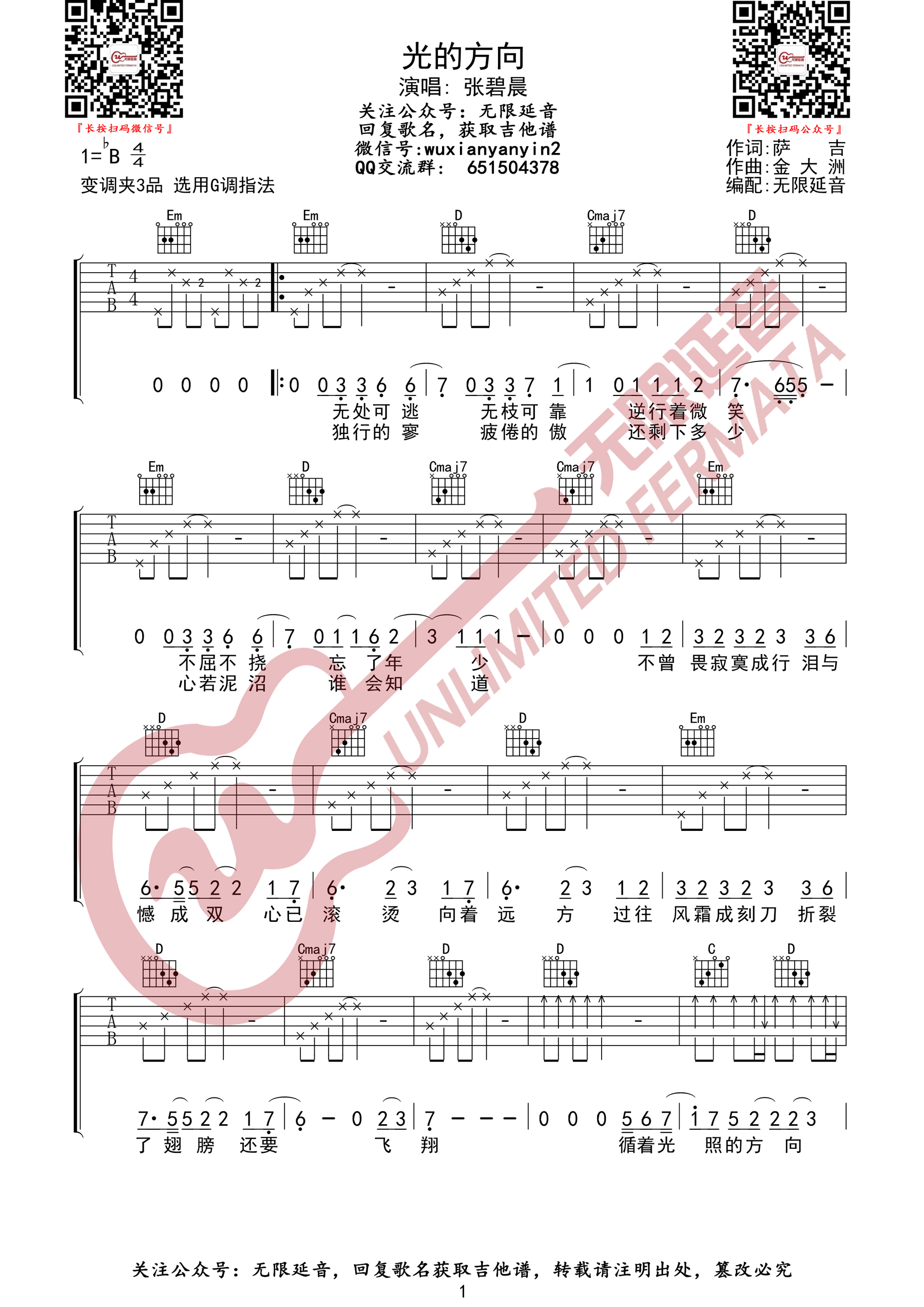 曲谱介绍: 张碧晨《光的方向》吉他弹唱谱,采用G调指法编配,共有2张高清图谱,免翻页排版设计。