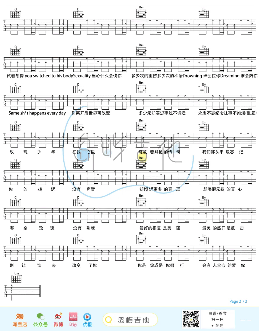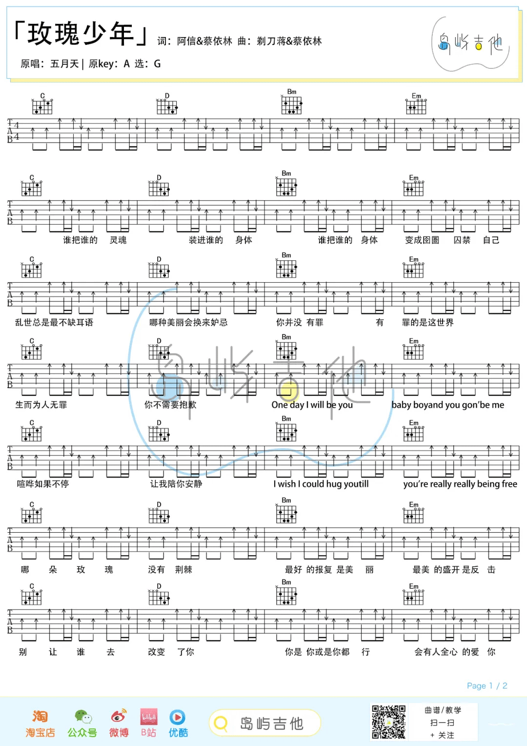 曲谱介绍: 五月天《玫瑰少年》吉他弹唱谱,采用G调指法编配,共有2张高清图谱,免翻页排版设计。