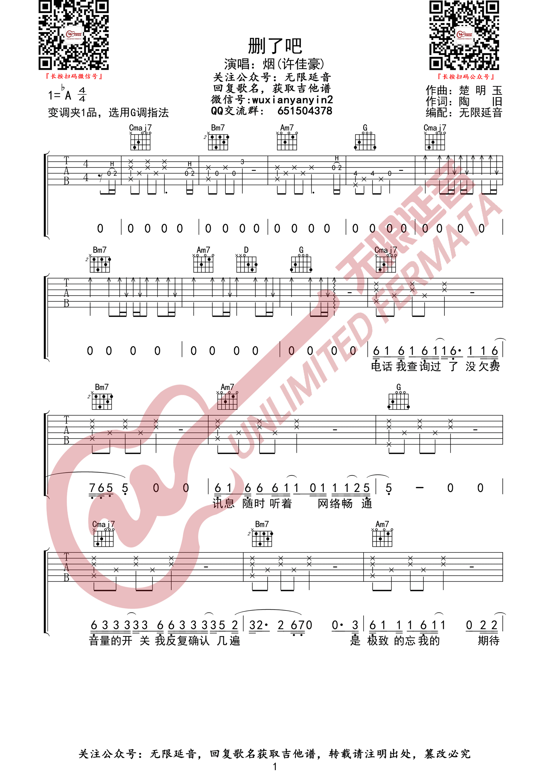 删了吧吉他谱 - (烟)许佳豪 - G调吉他弹唱谱 - 原版